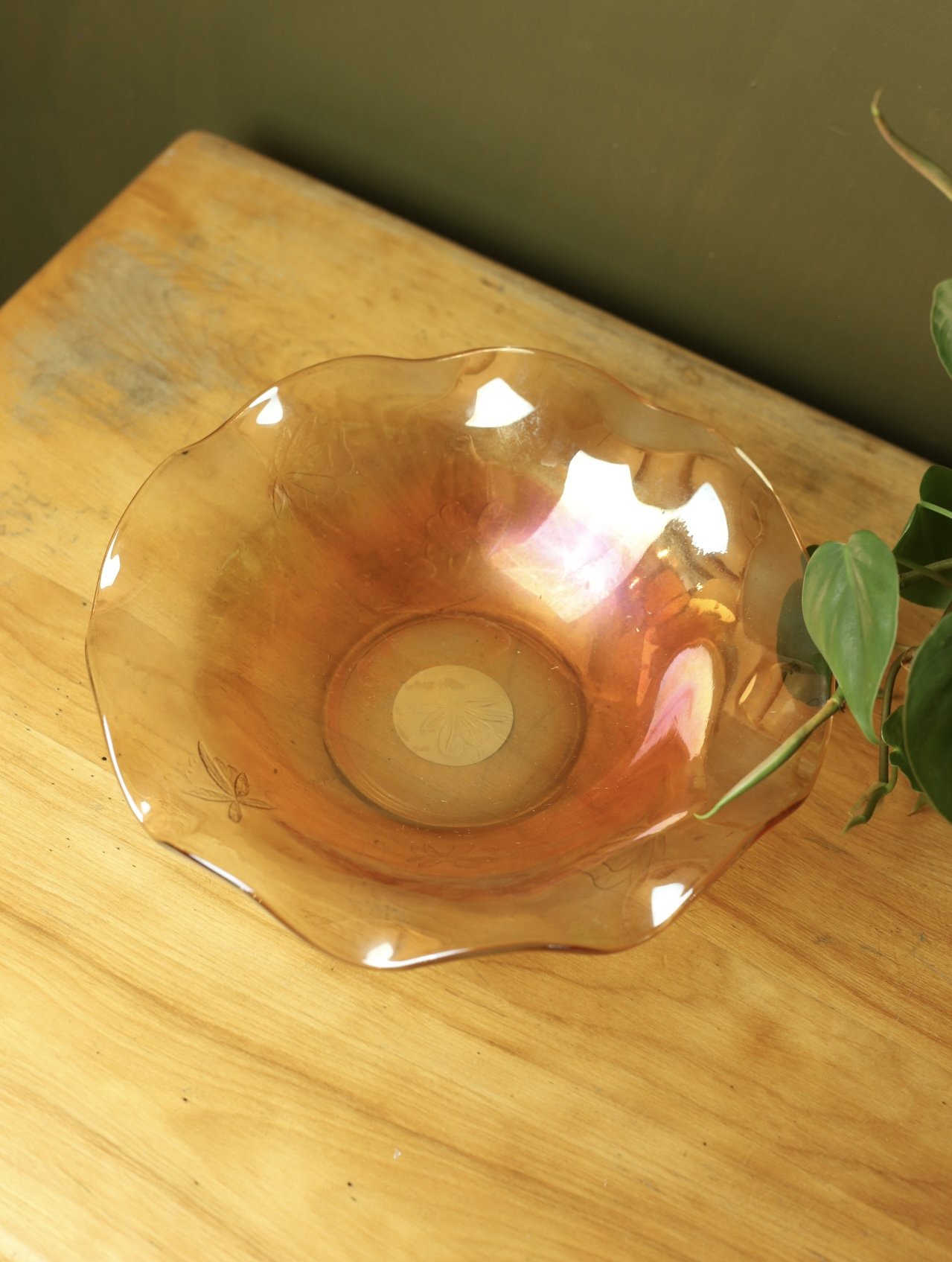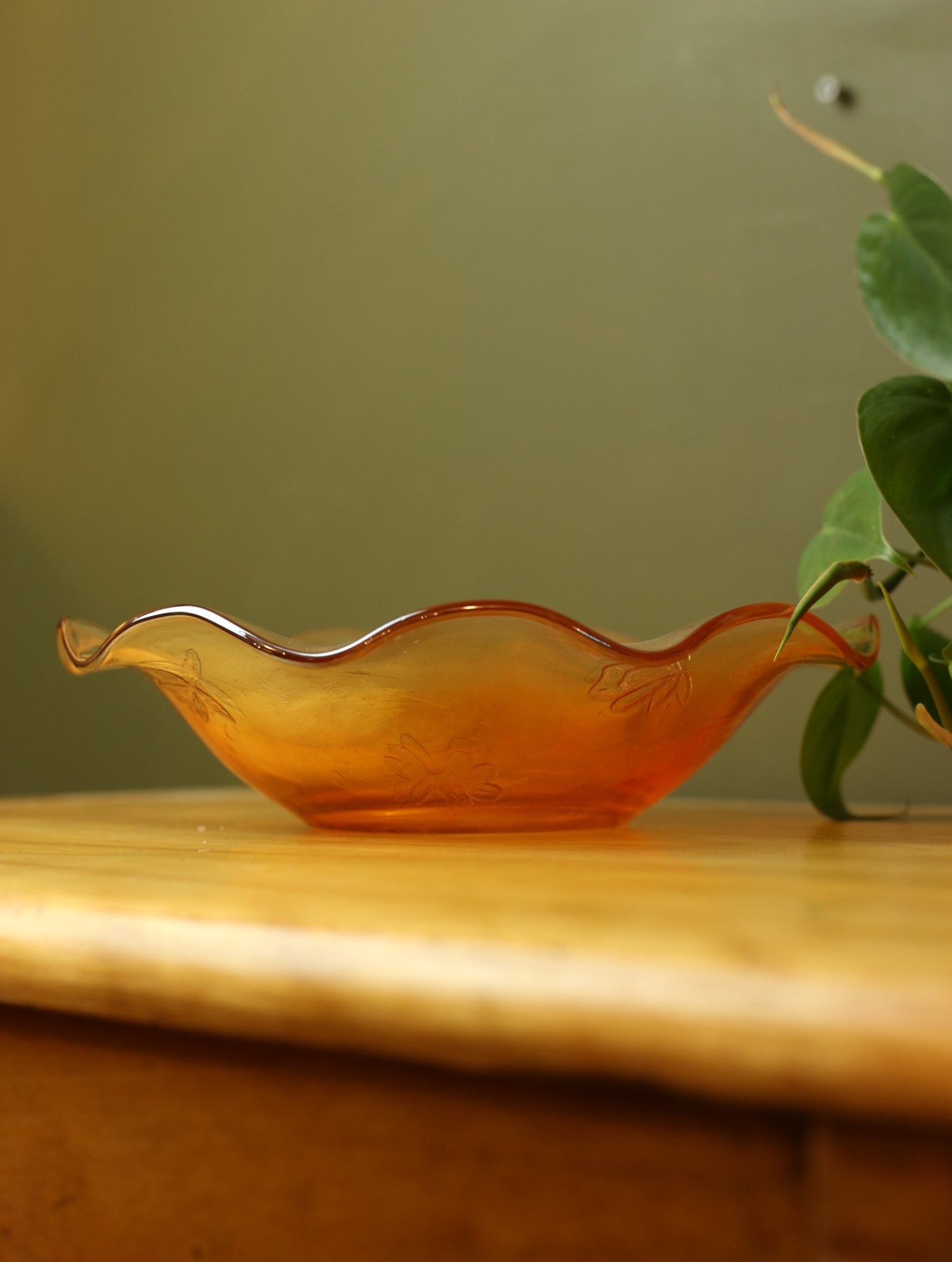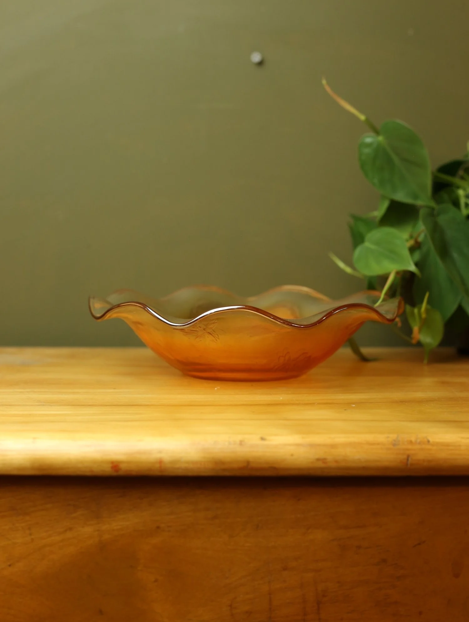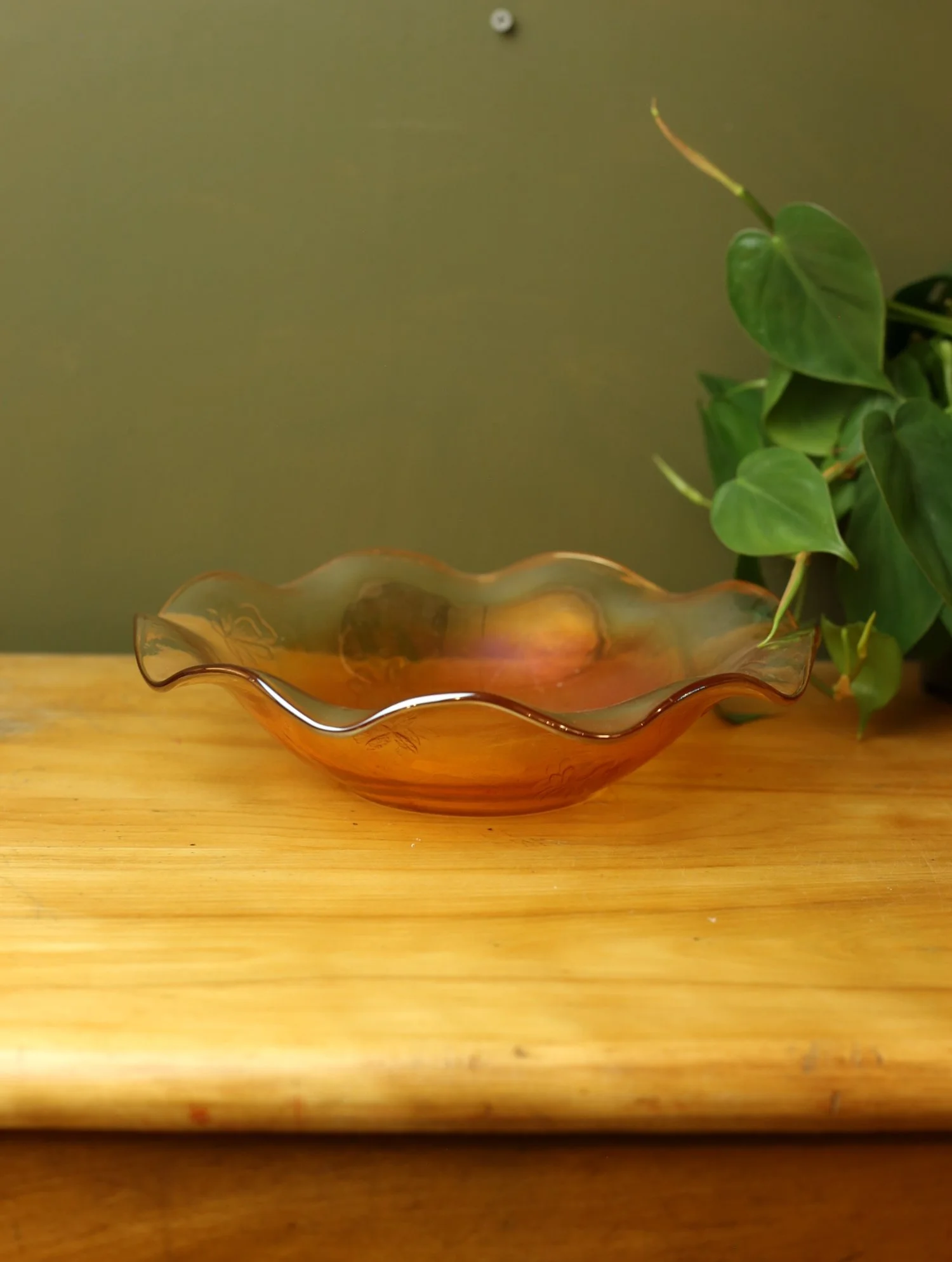 Stunning vintage carnival glass dish with a floral design and a ruffled edge