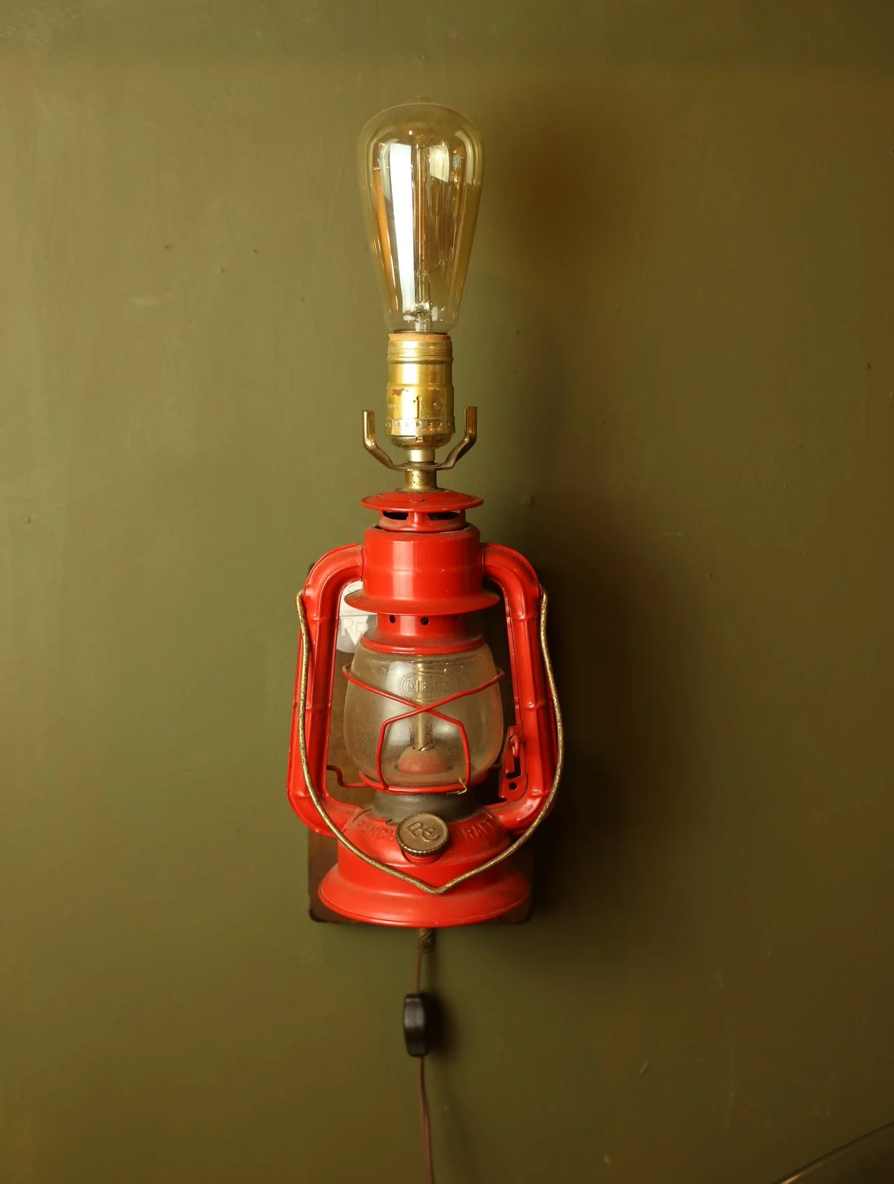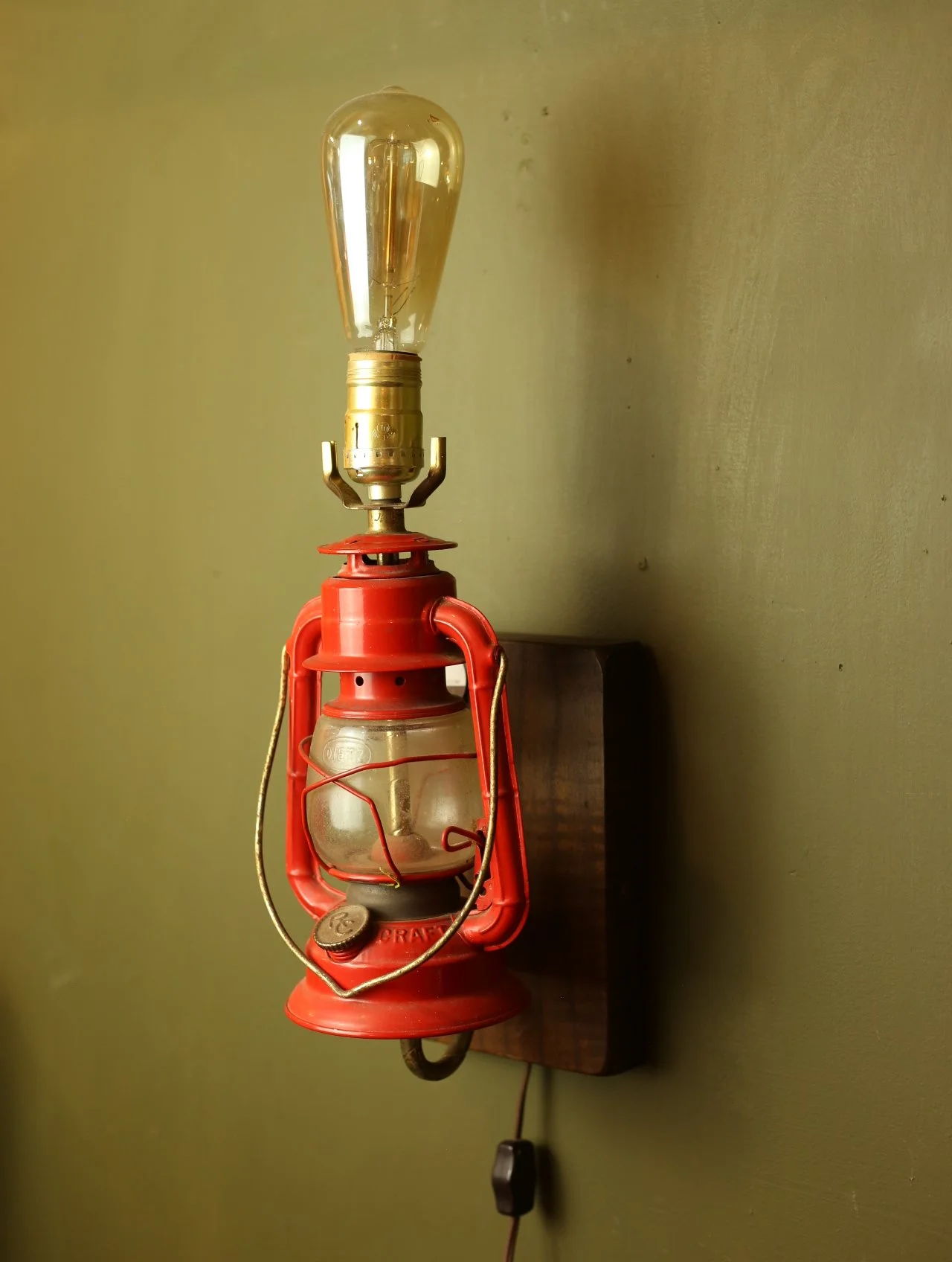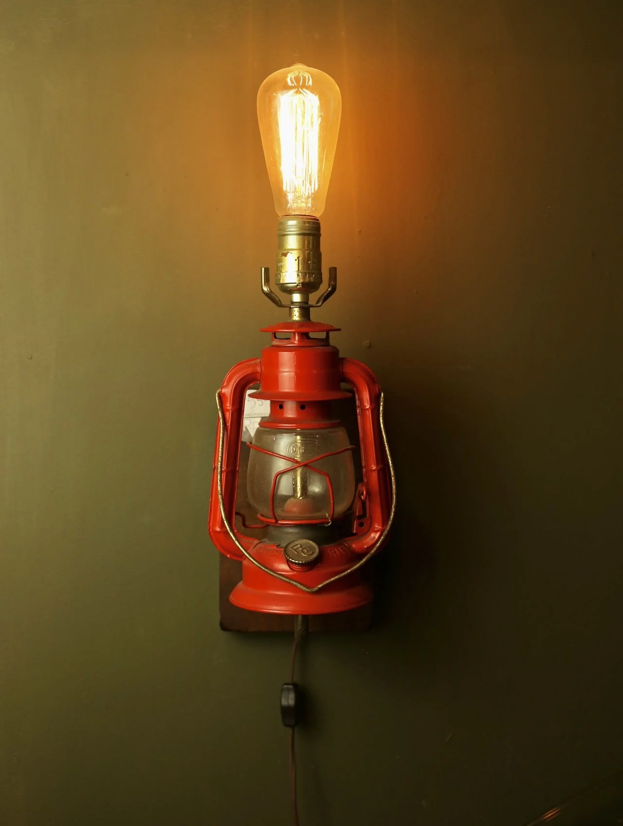 Sconce made from a repurposed red oil lantern mounted on wood