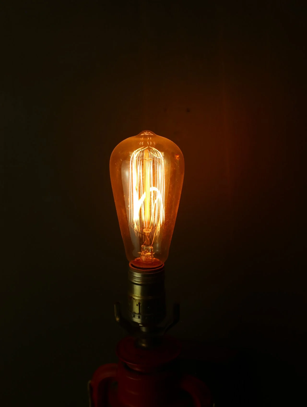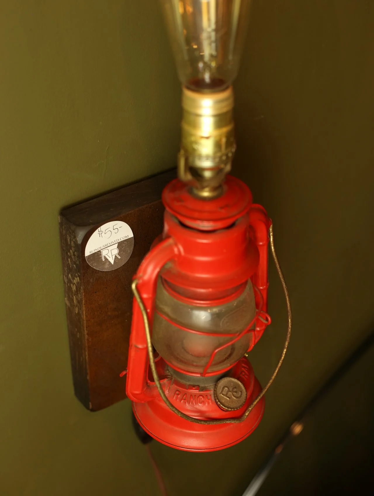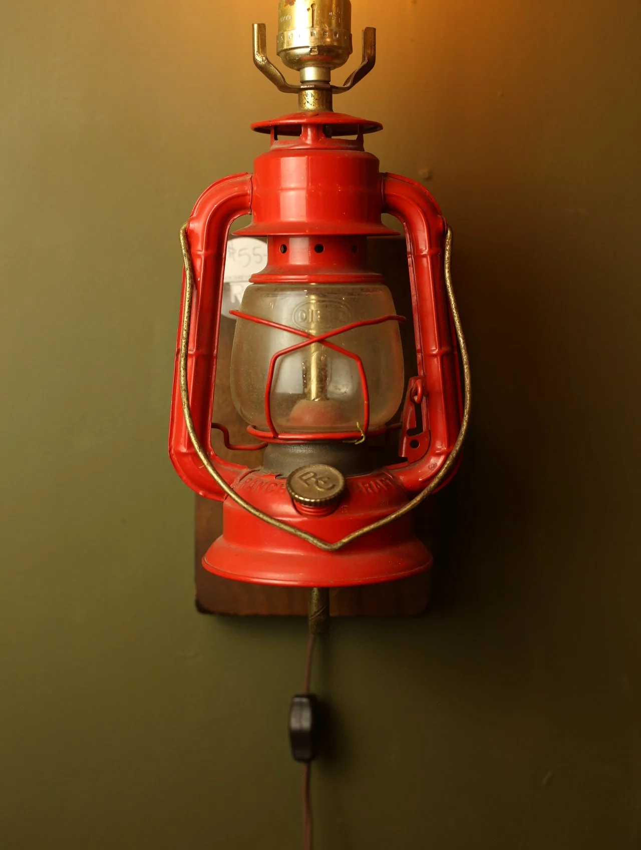 Sconce made from a repurposed red oil lantern mounted on wood