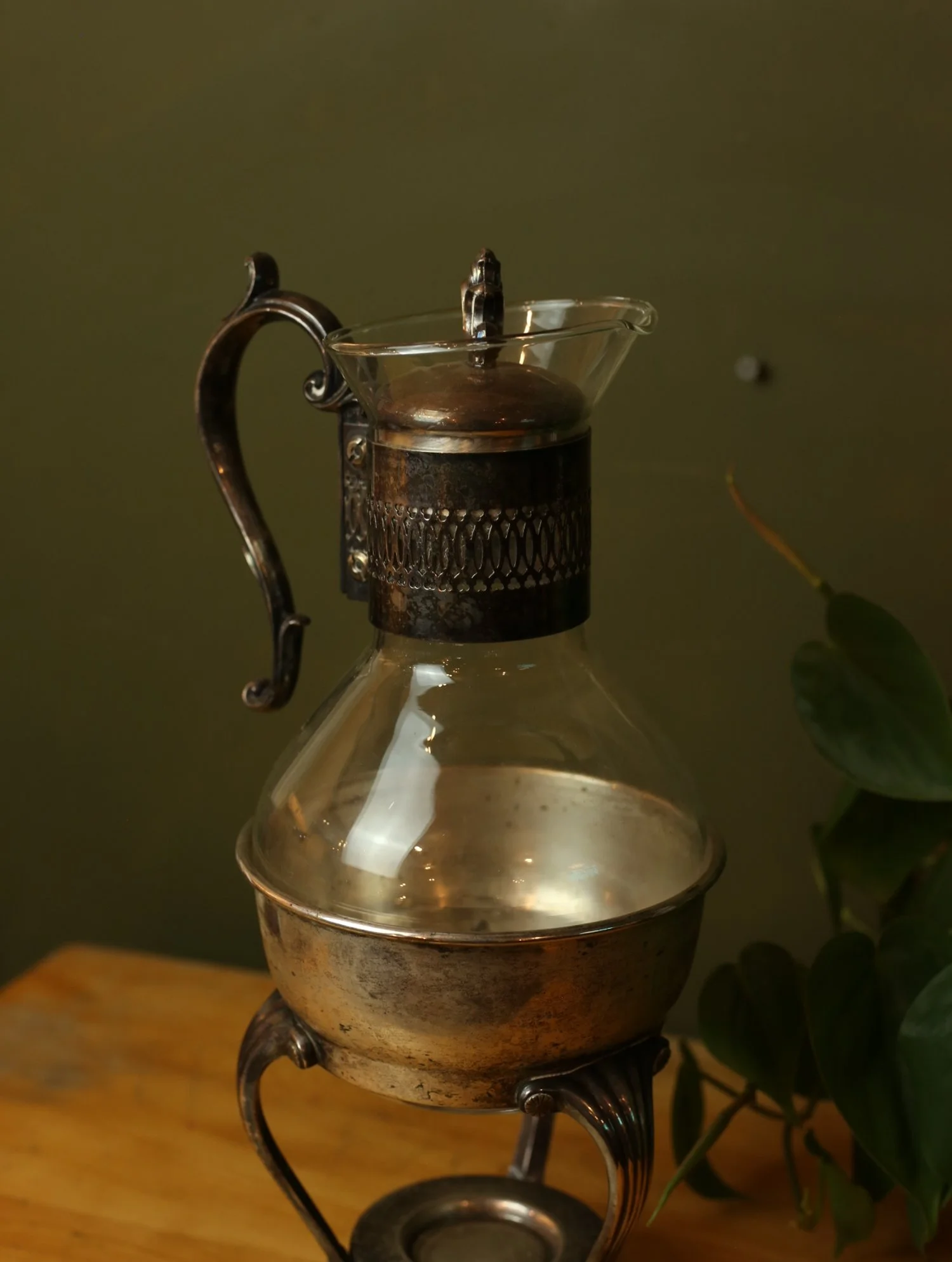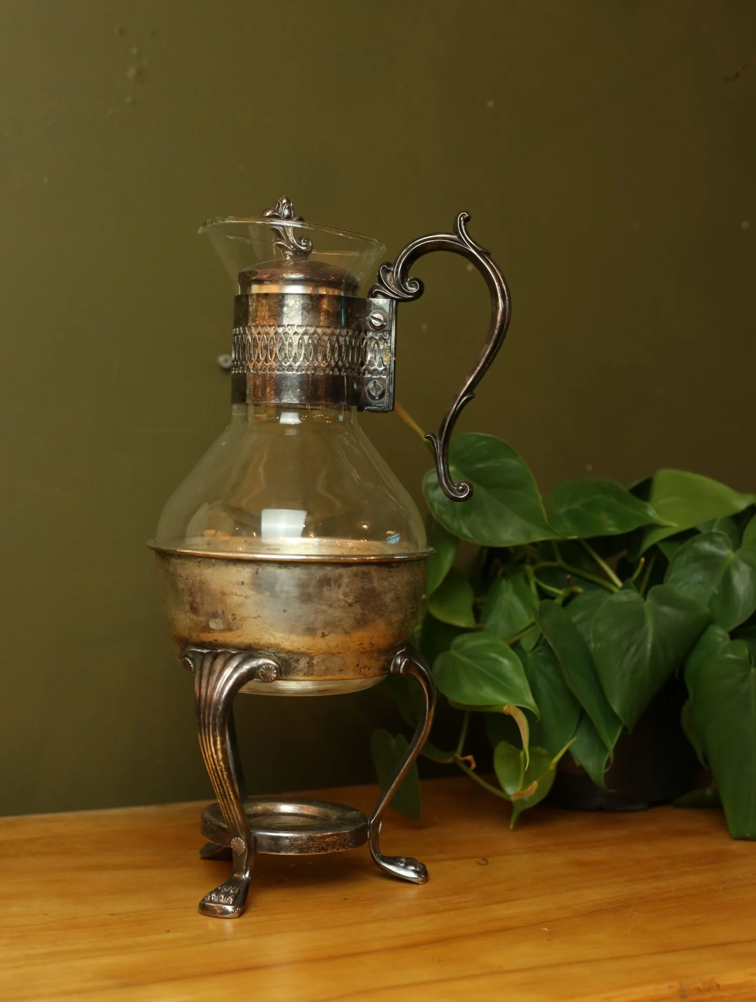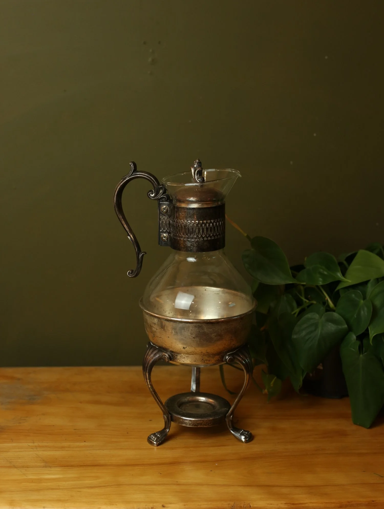 Beautiful vintage carafe. The Carafe has a glass body with a silver plated handle, lid, and warming stand