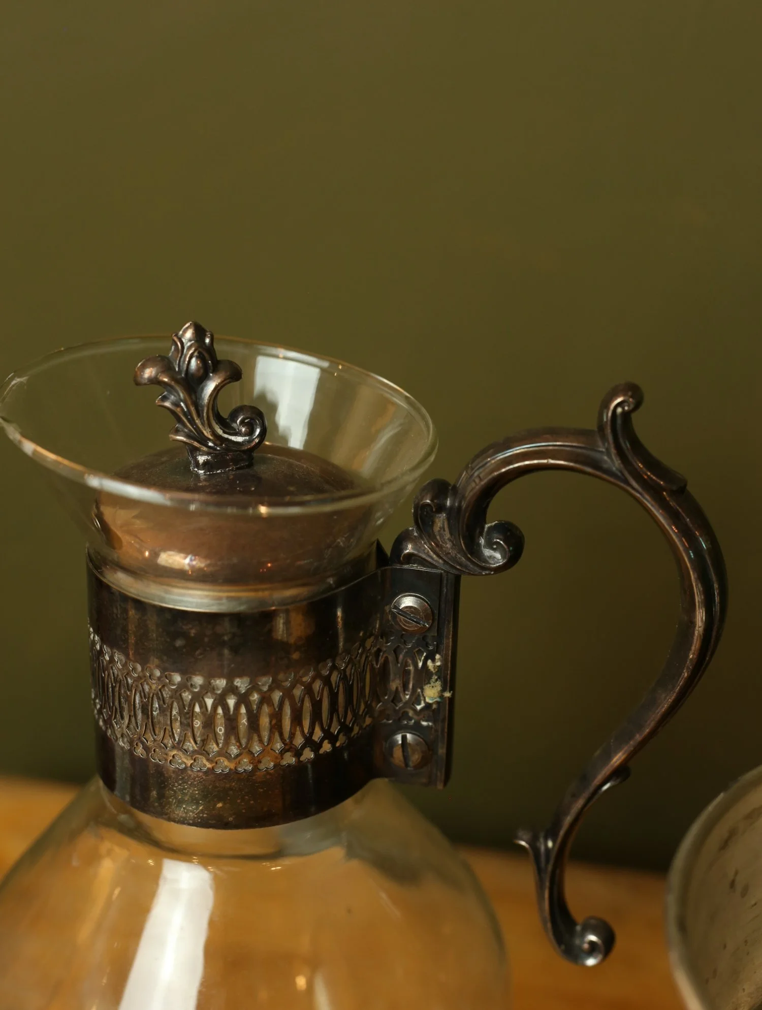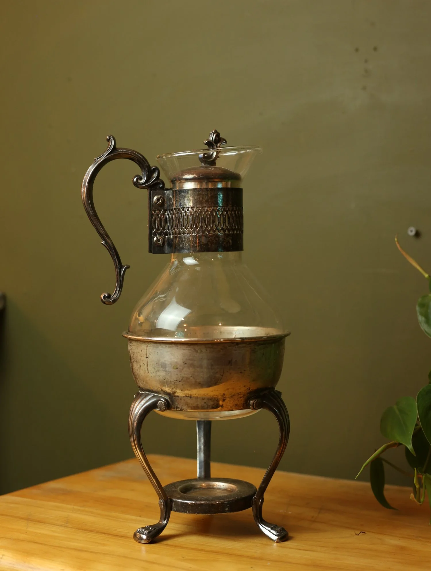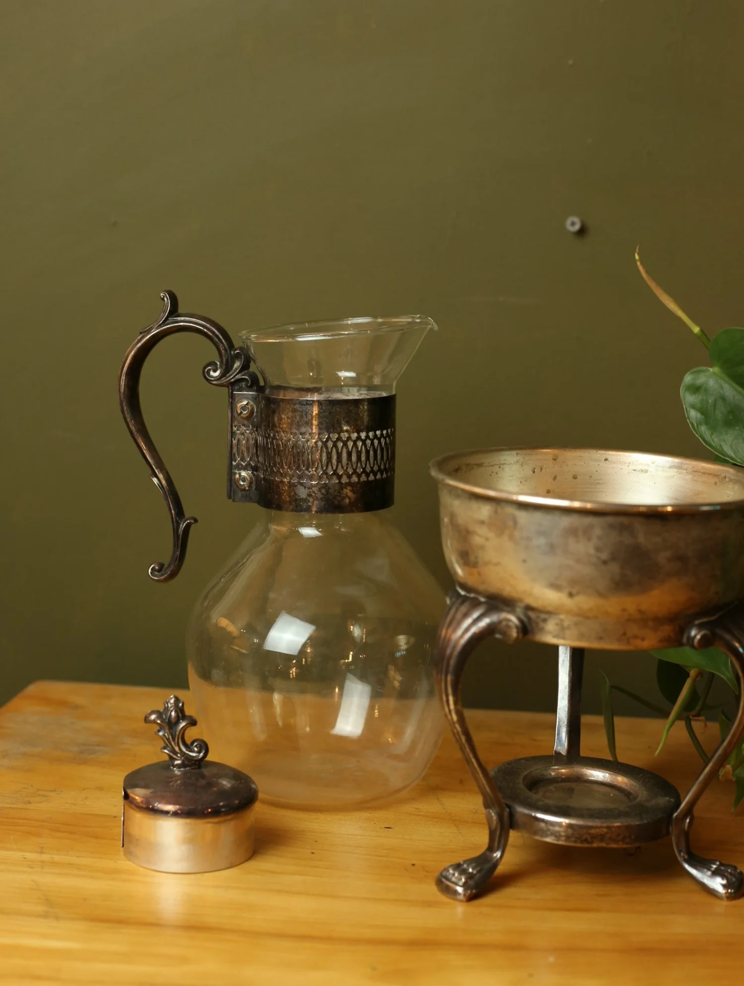 Beautiful vintage carafe. The Carafe has a glass body with a silver plated handle, lid, and warming stand