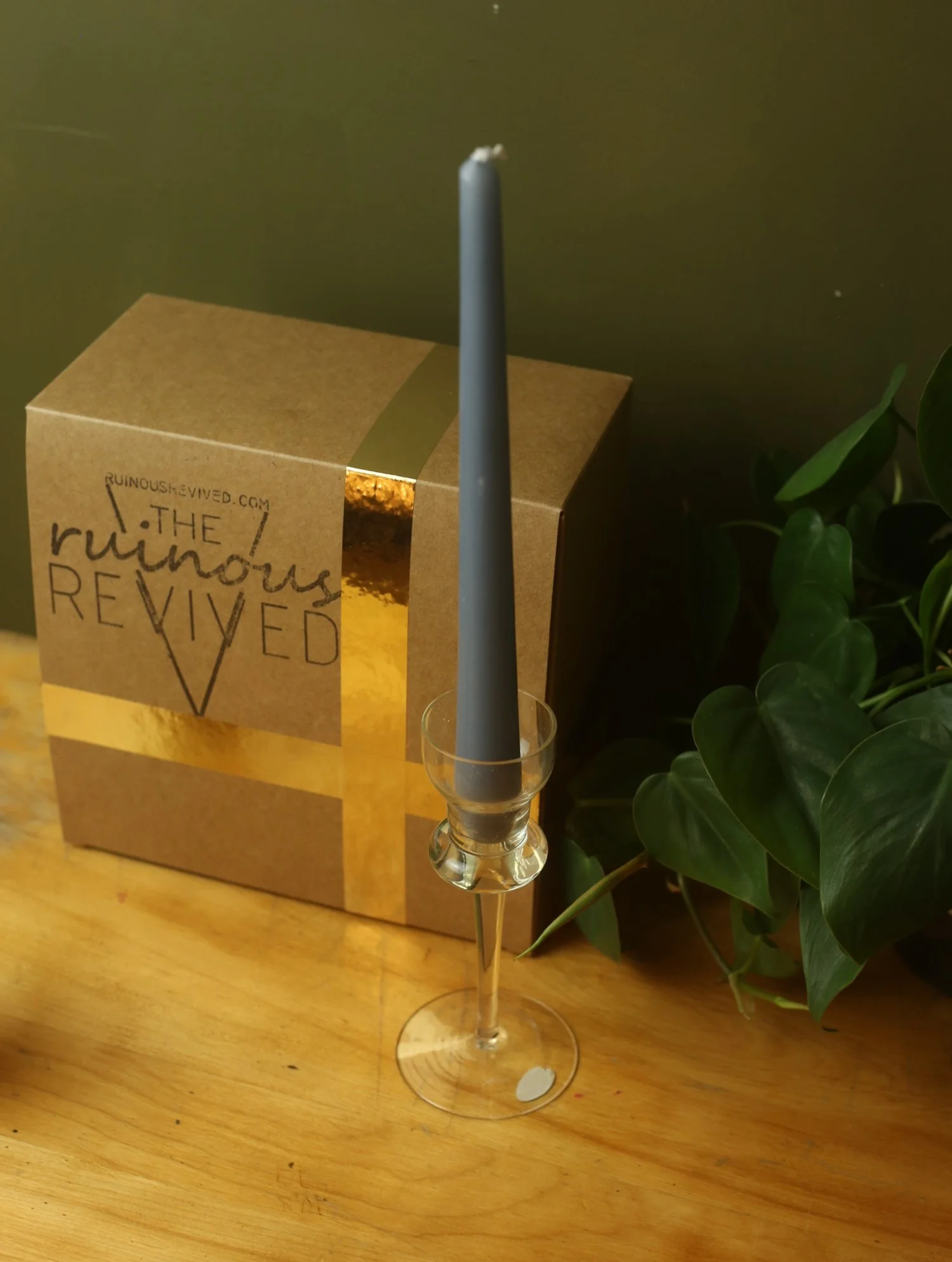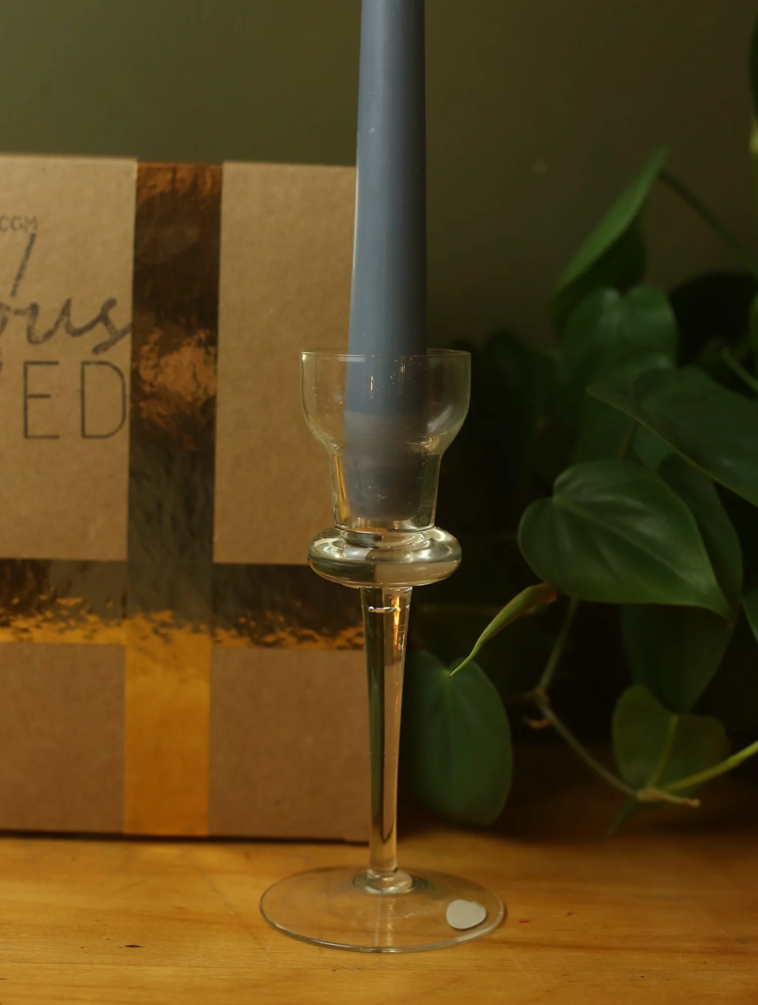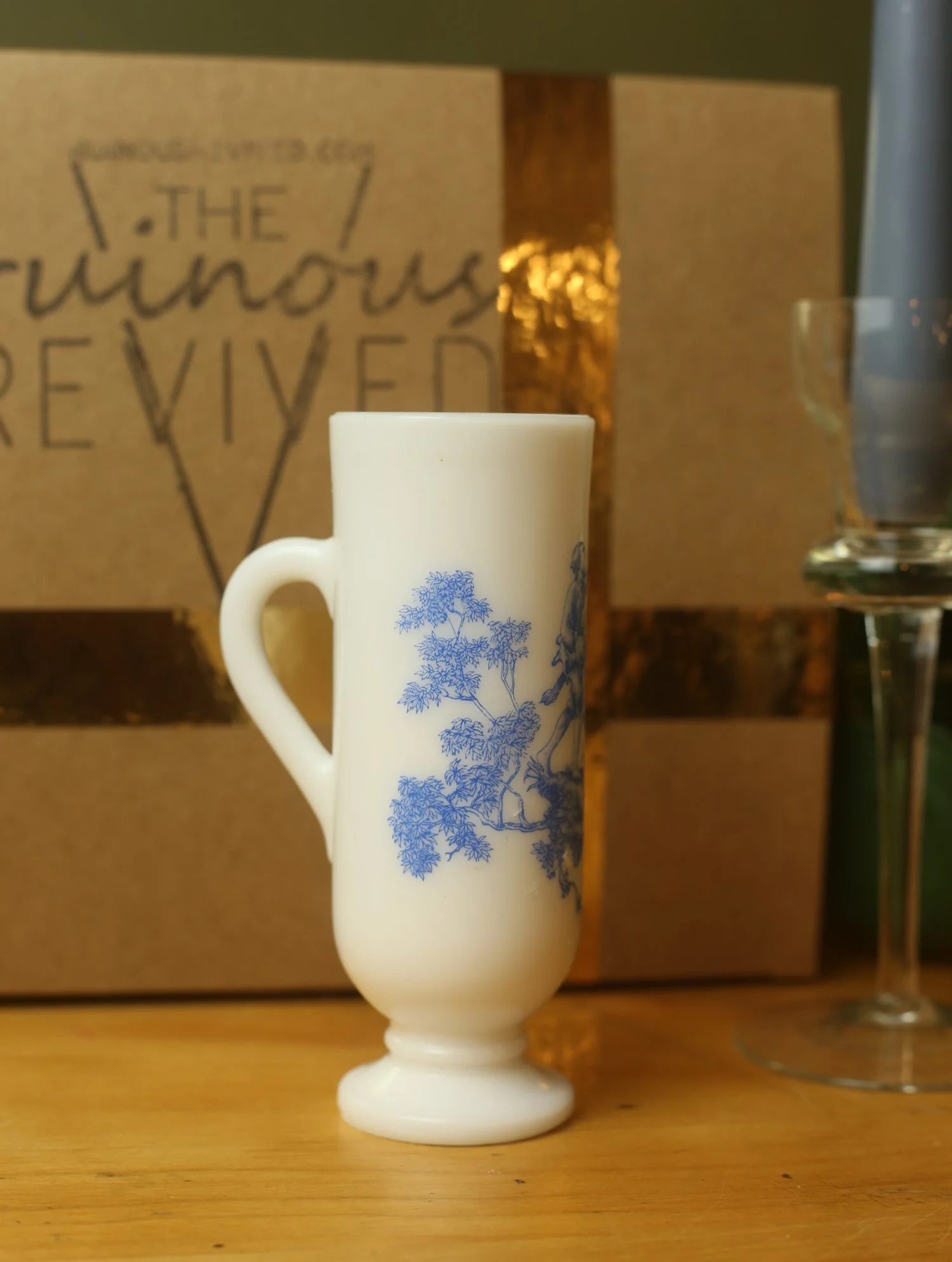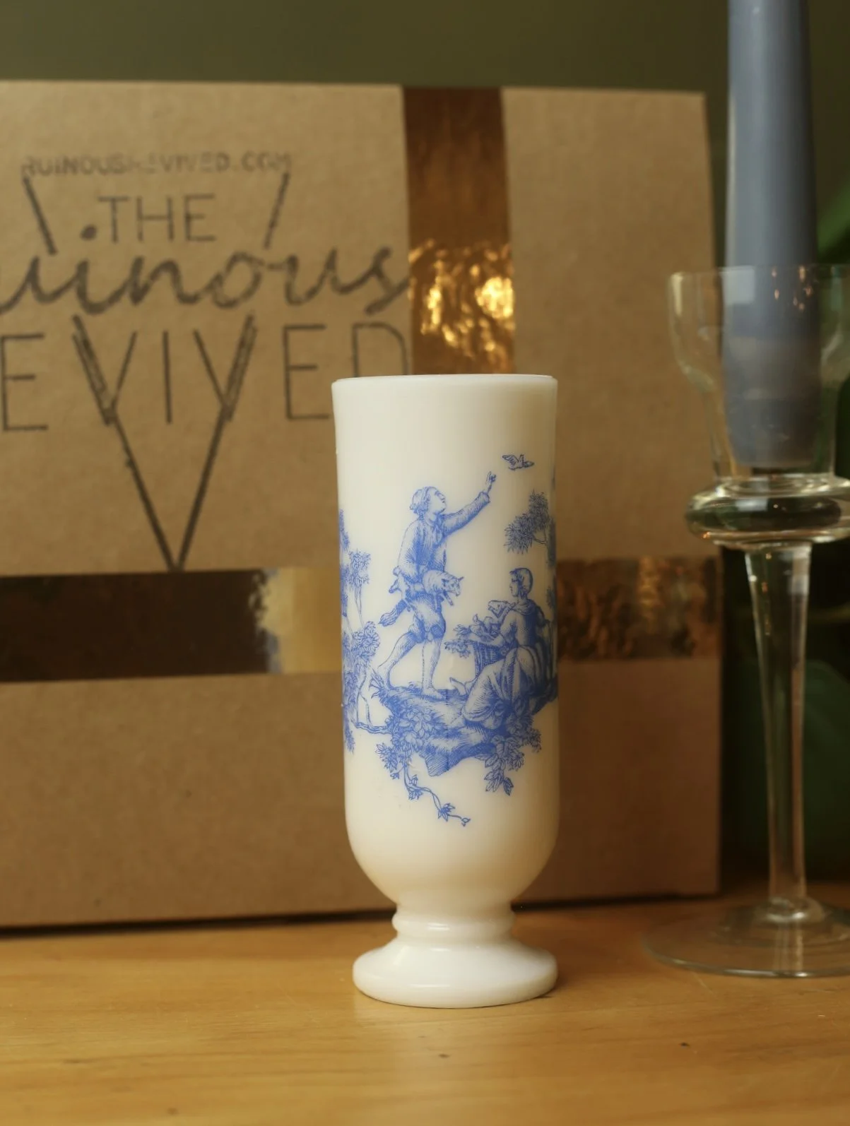 Includes a vintage Avon milk, glass Demi Cup with a blue line portrait on it, A glass candlestick holder, and a blue dripless candlestick