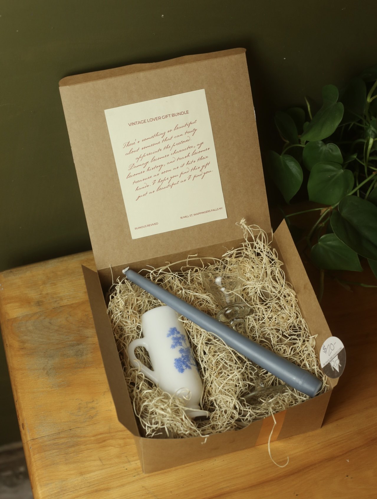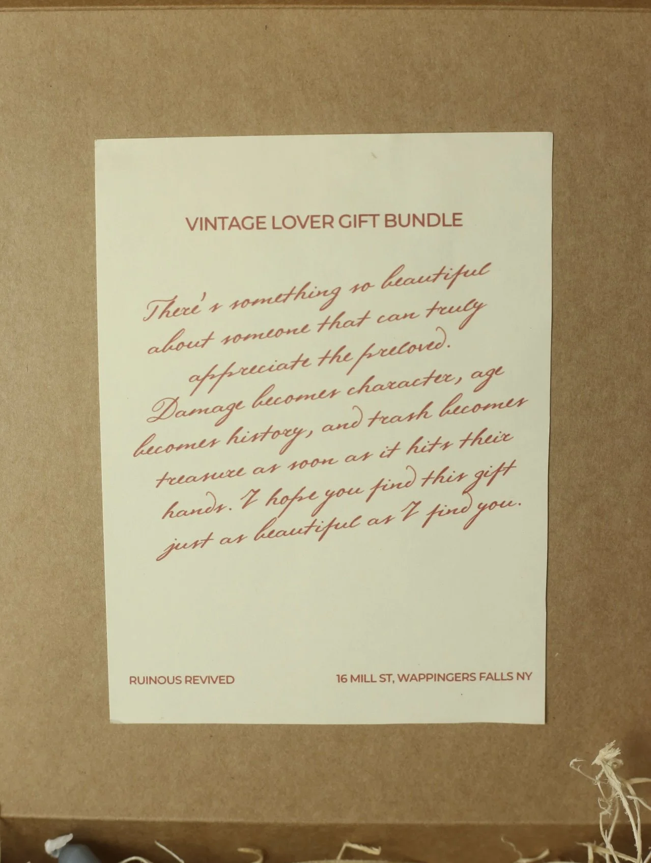 Includes a handwritten note that reads: There's something so beautiful about someone that can truly appreciate the preloved. Damage becomes character, age becomes history, and trash becomes treasure as soon as it hits their hands. I hope you find this set just a beautiful as I find you.