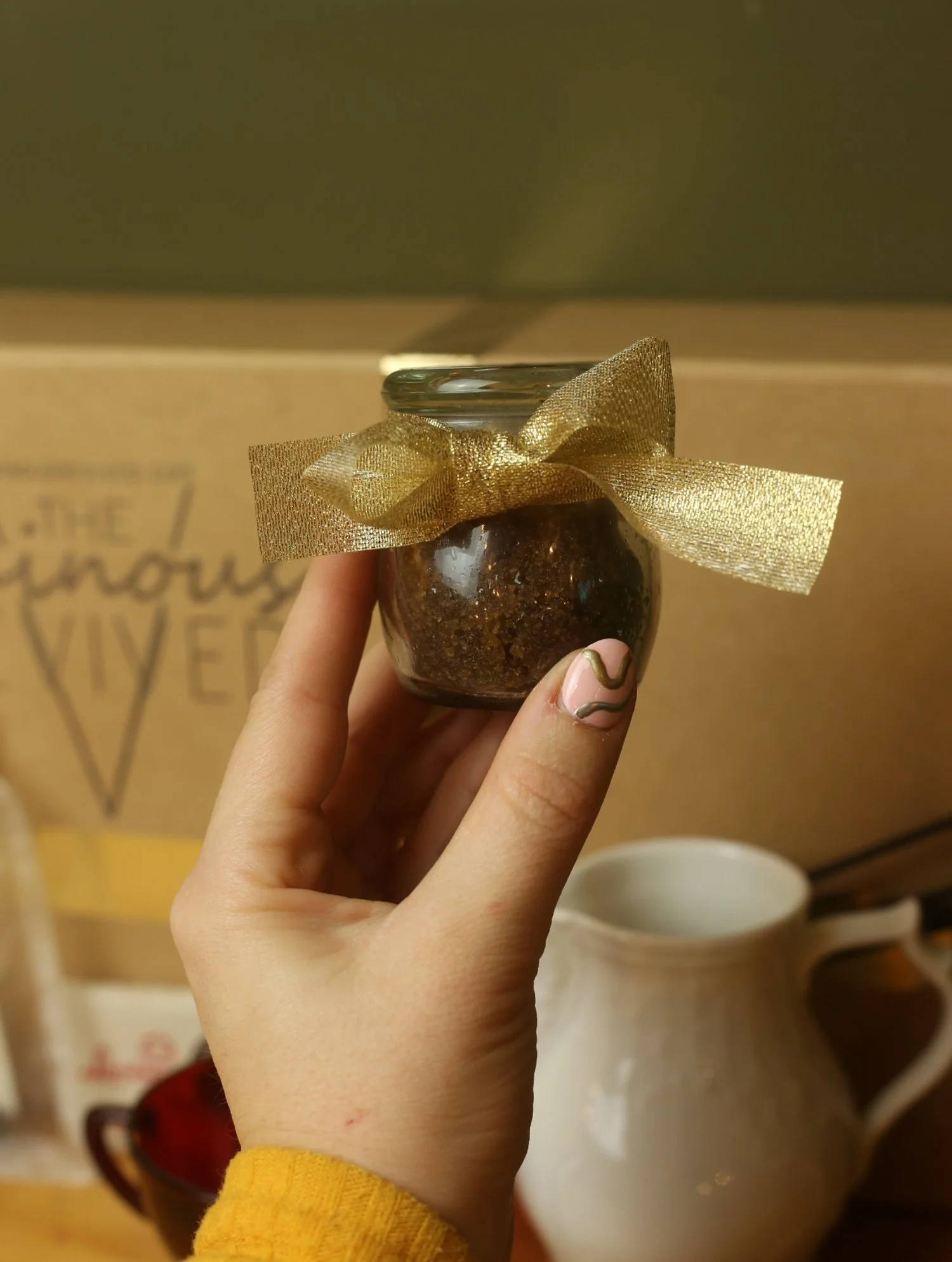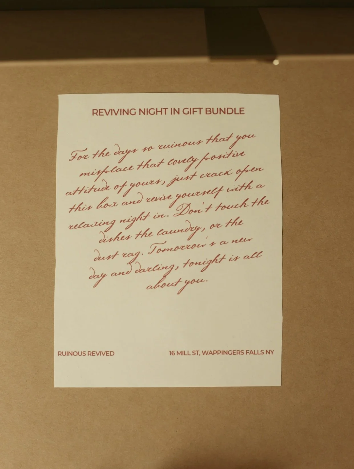 • Inside is a note that reads: For the days so ruinous that you misplace that lovely positive attitude of yours,  just crack open this box and revive yourself with a relaxing night in. Don't touch the dishes, the laundry or the dust rag. Tomorrow's a new day and darling, tonight is all about you.