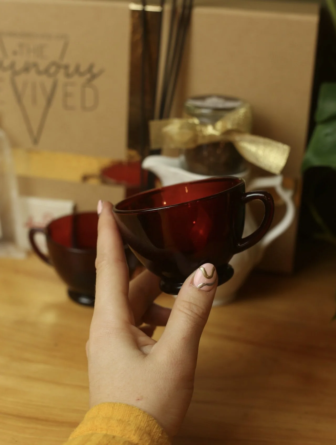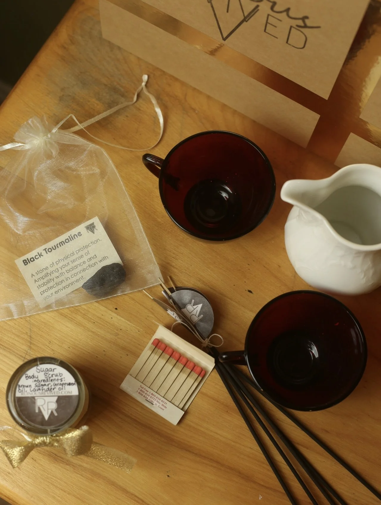 • Includes a two vintage red tea cups, 5 incense sticks, a white porcelain creamer cup, a lavender brown sugar scrub, a black tourmaline stone, and a vintage match book from ‘landmark the tower’