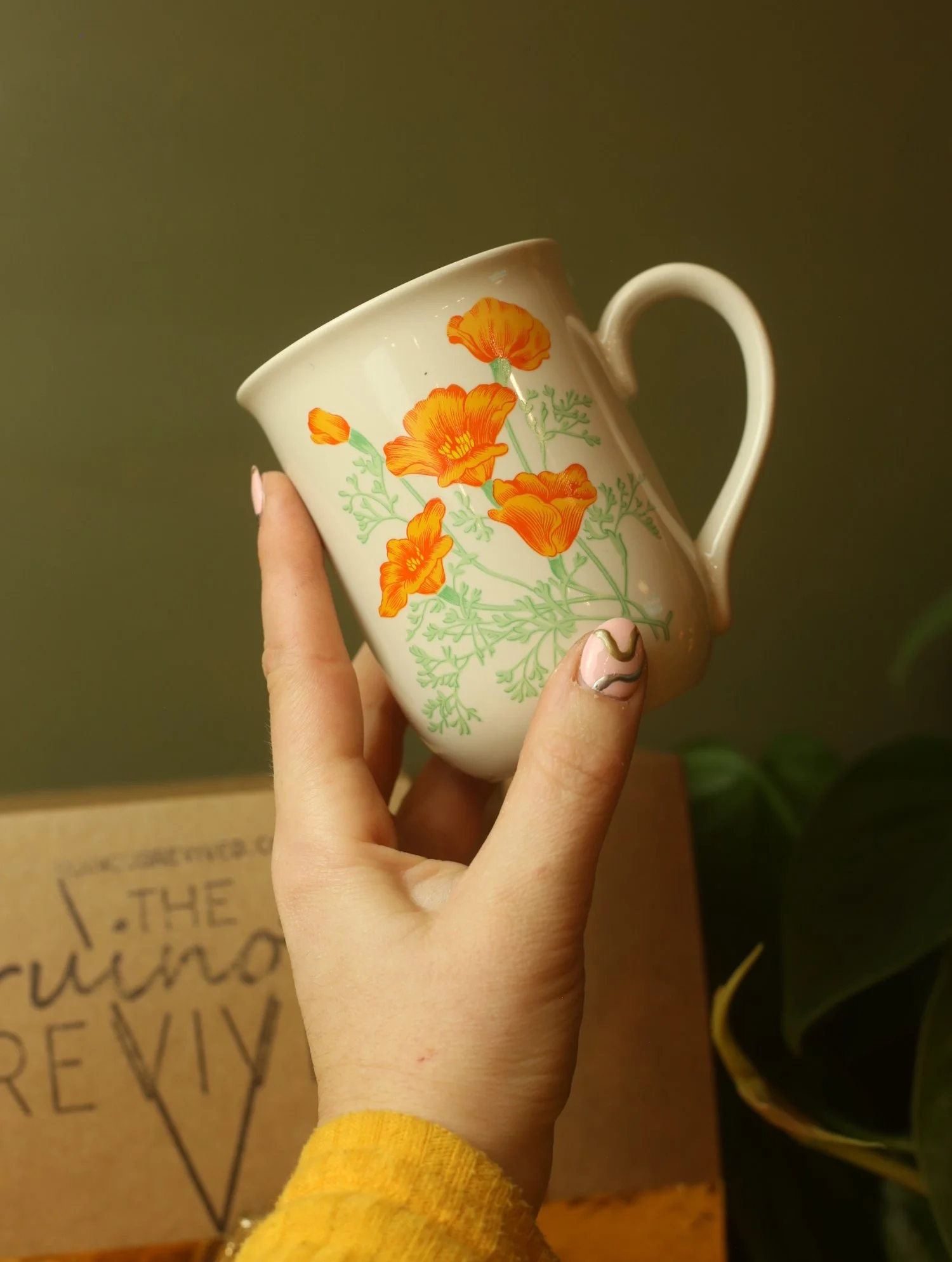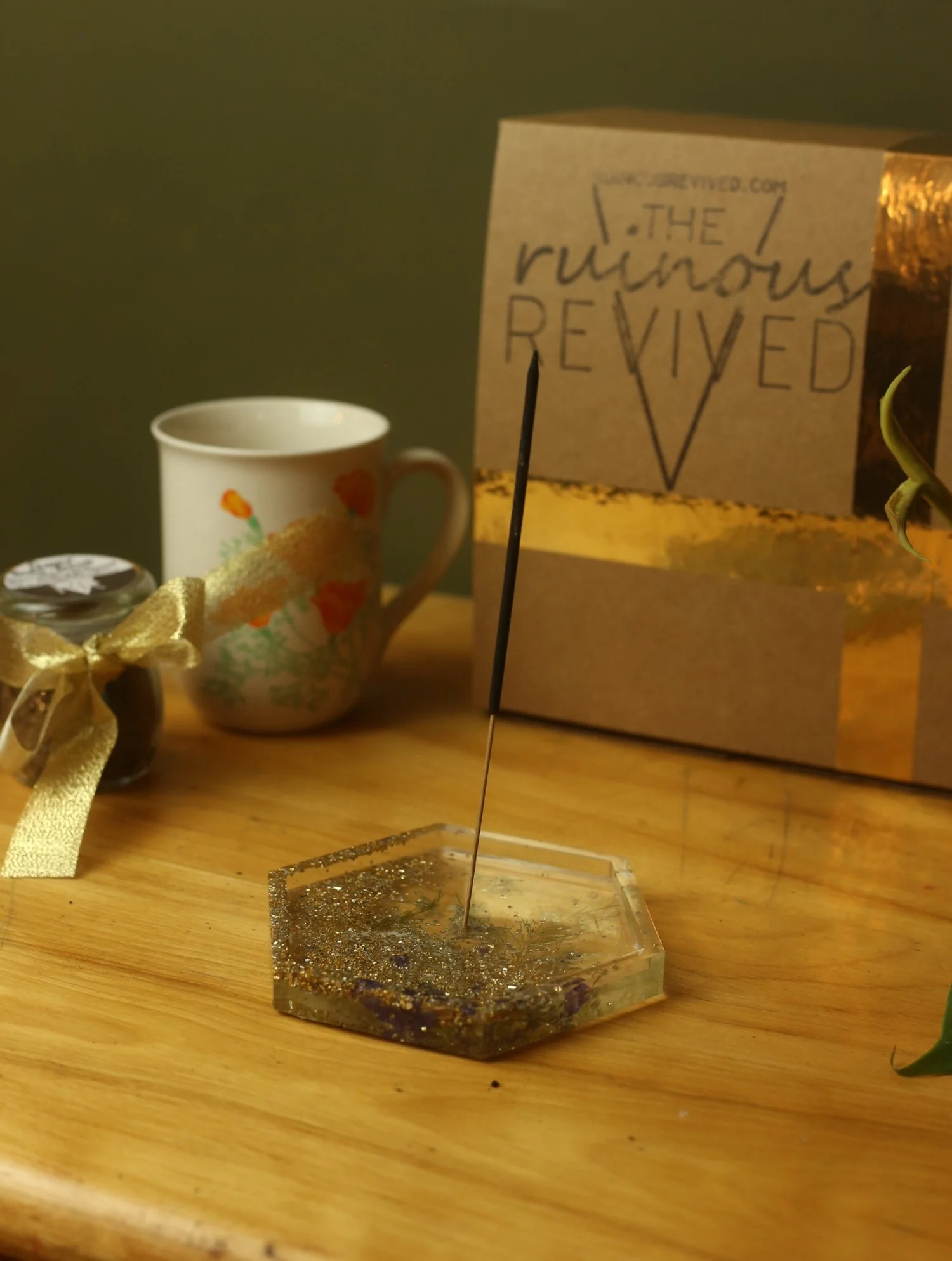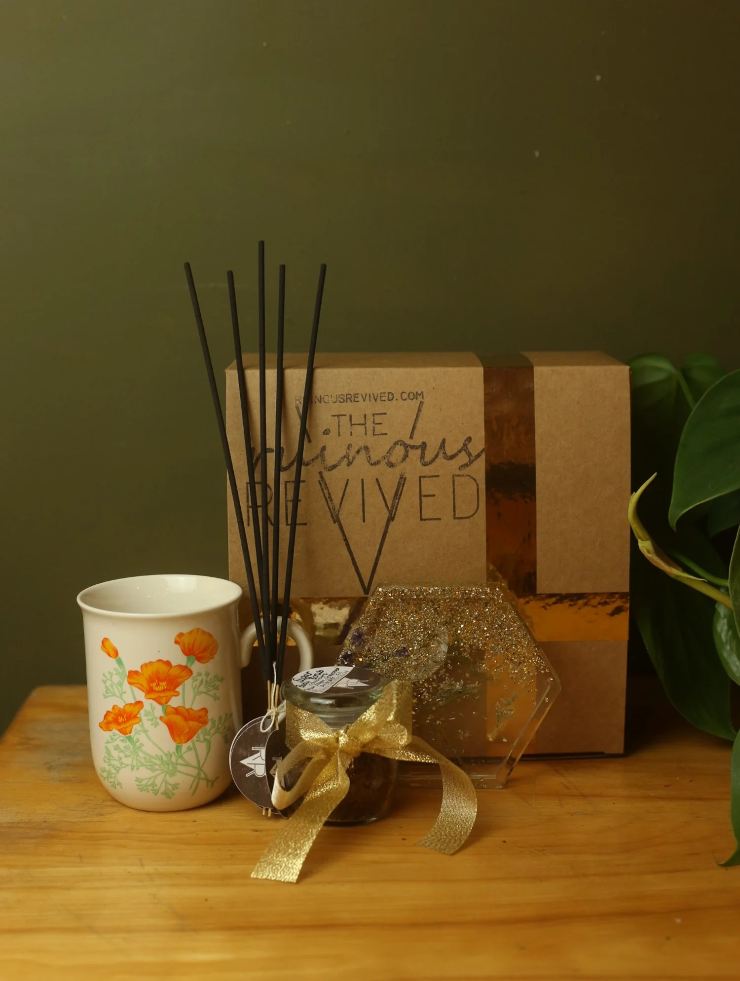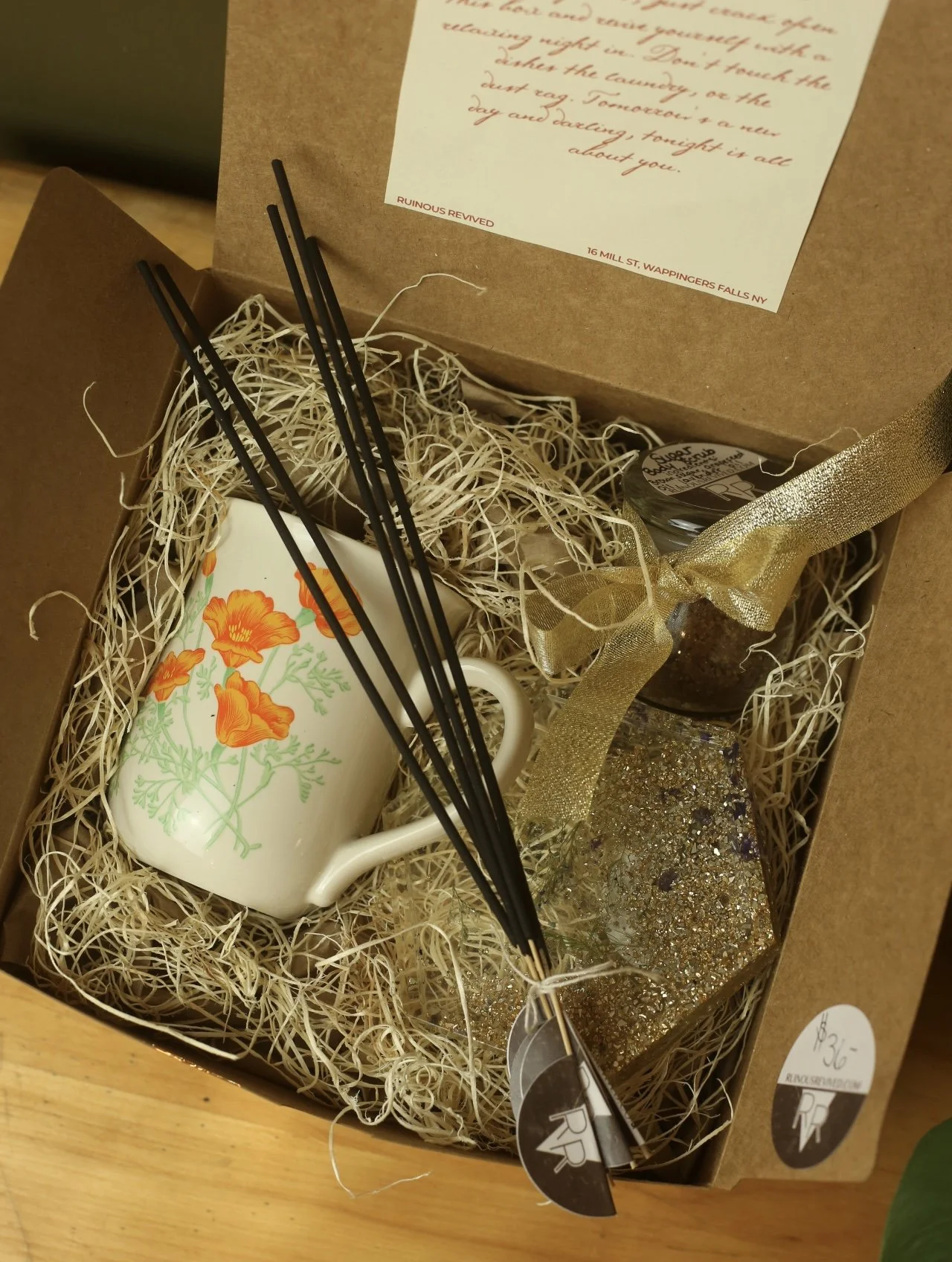 • Includes a 5 incense sticks, a vintage mug with an adorable design of orange flowers, a handmade resin incense holder, and a jar of lavender brown sugar scrub