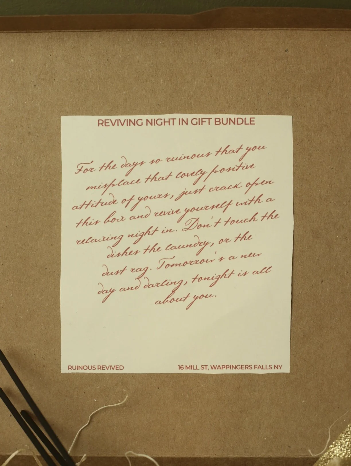 • Inside is a note that reads: For the days so ruinous that you misplace that lovely positive attitude of yours,  just crack open this box and revive yourself with a relaxing night in. Don't touch the dishes, the laundry or the dust rag. Tomorrow's a new day and darling, tonight is all about you.