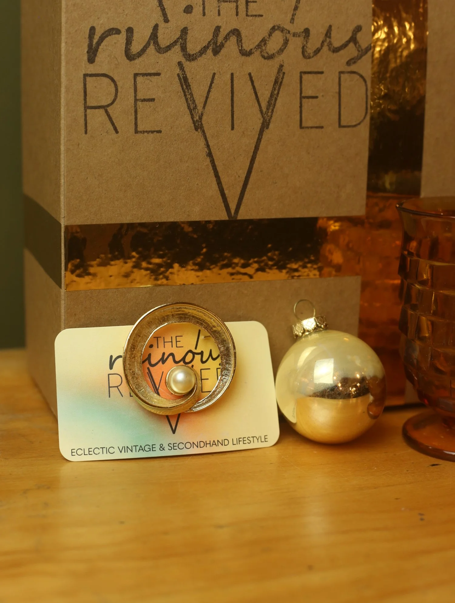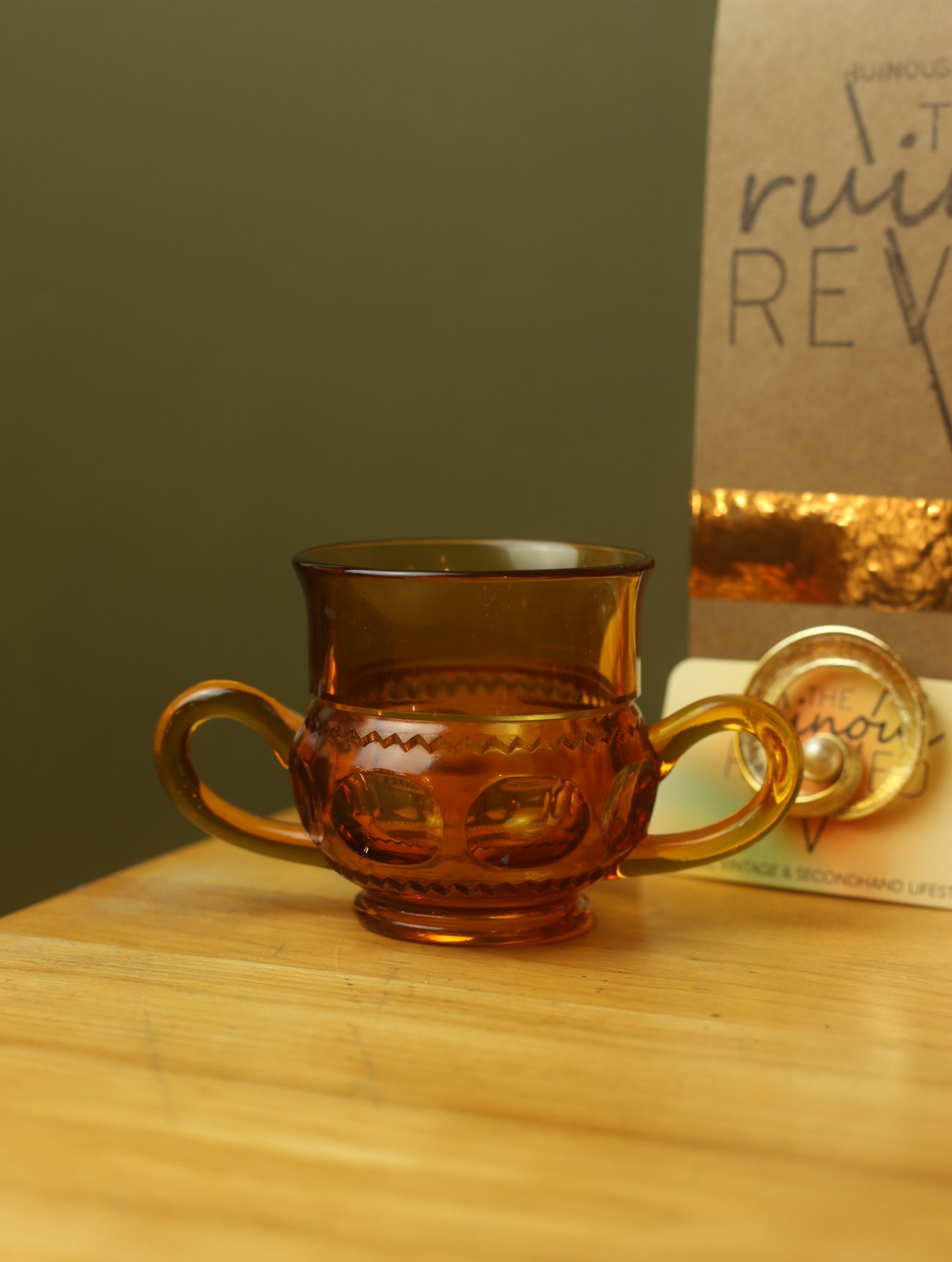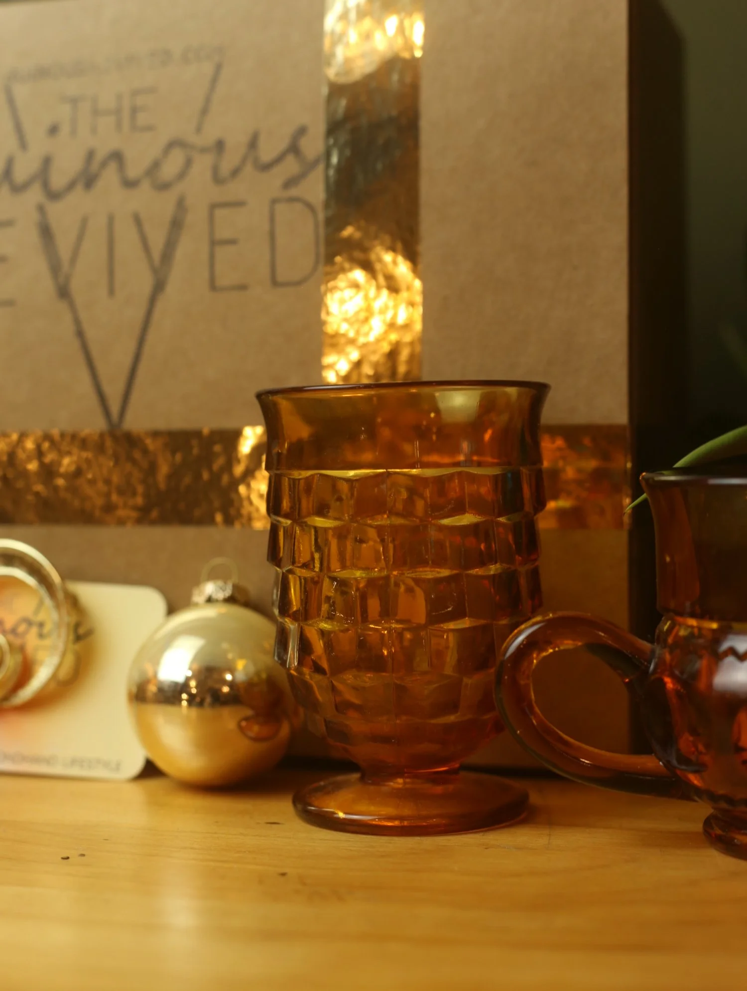 Includes an amber sugar cup, an amber glass, a gold small Christmas ornament, a gold tone pin with a faux pearl
