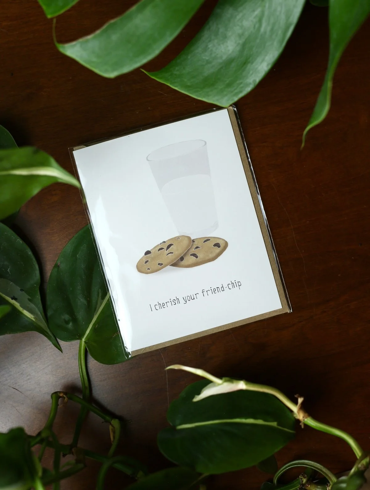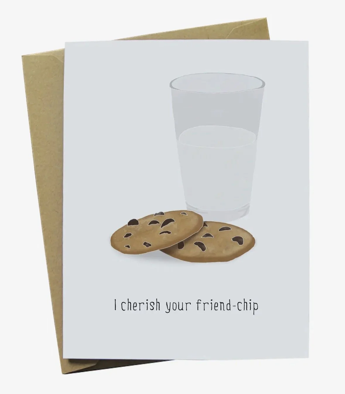 Greeting card with an illustration of a two cookies and a glass of milk with texts that reads ‘I cherish your friend-chip’