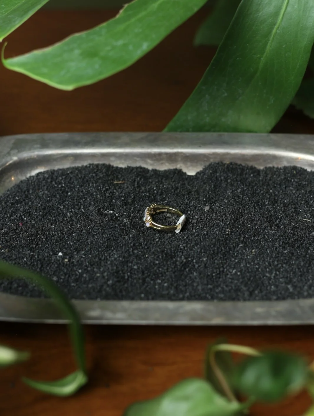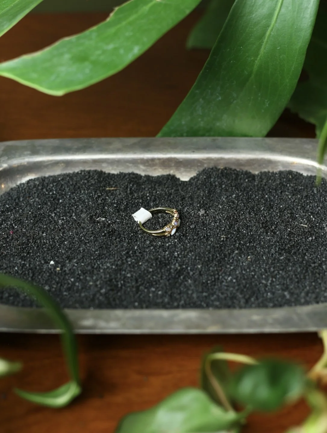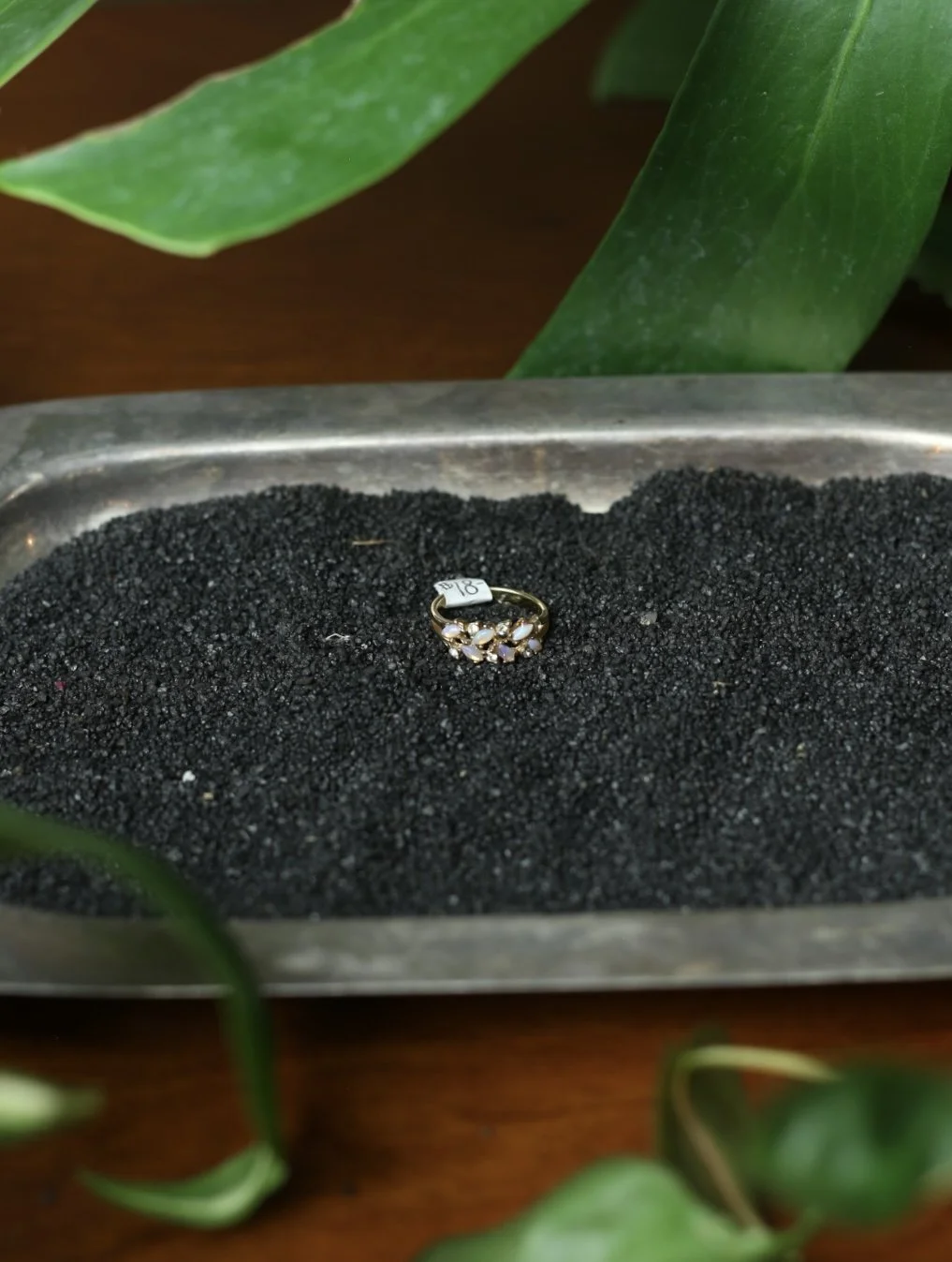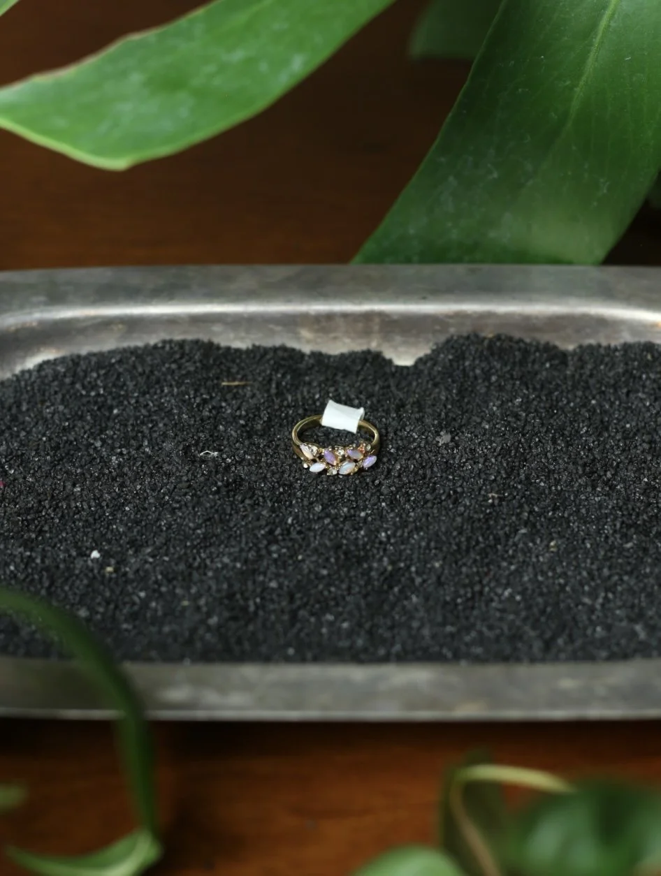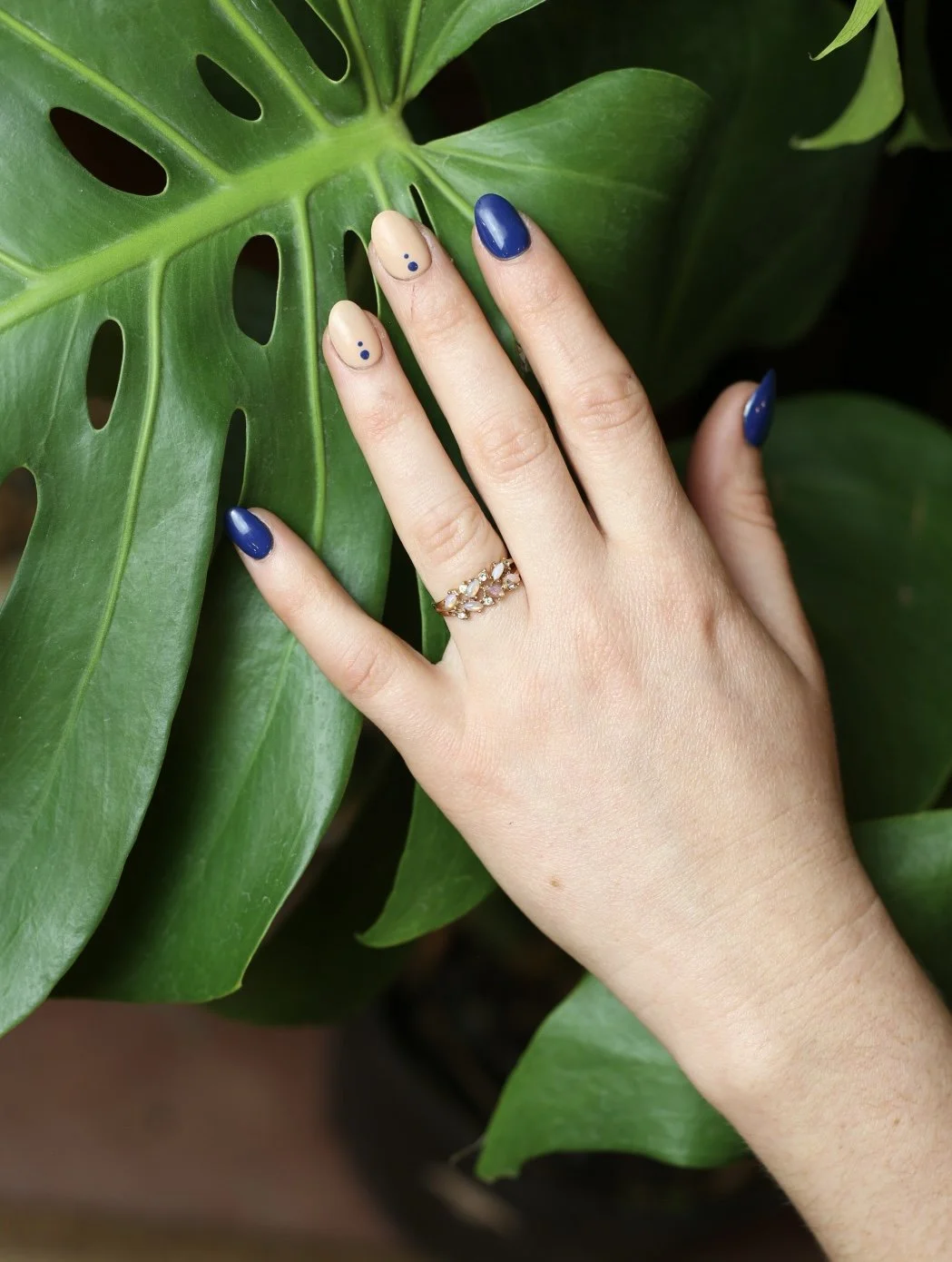 Gold tone cluster ring with diagonal marquis shaped opal stones and small clear gems