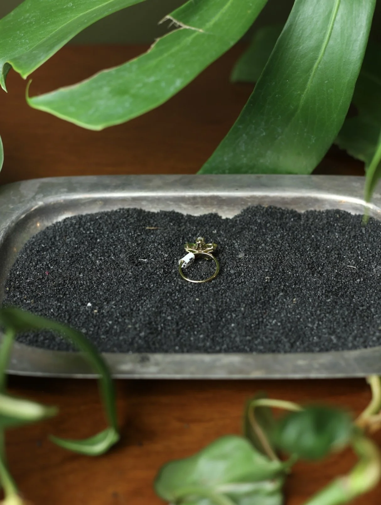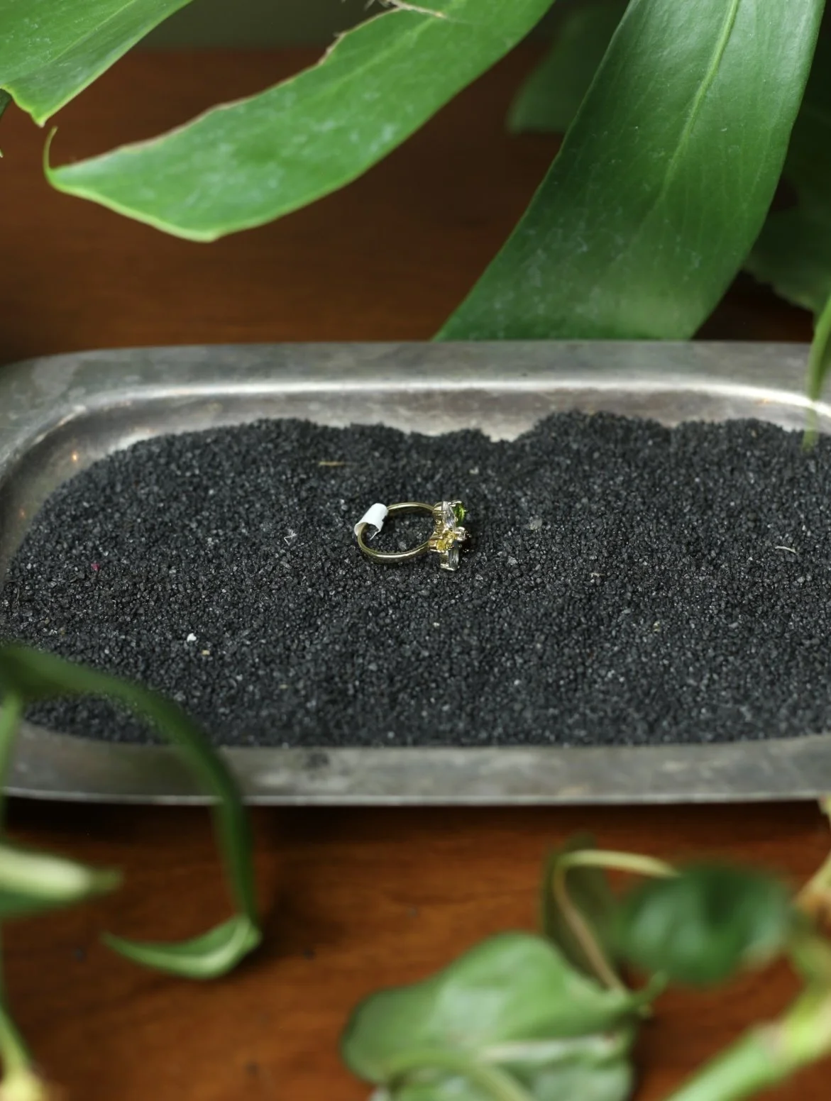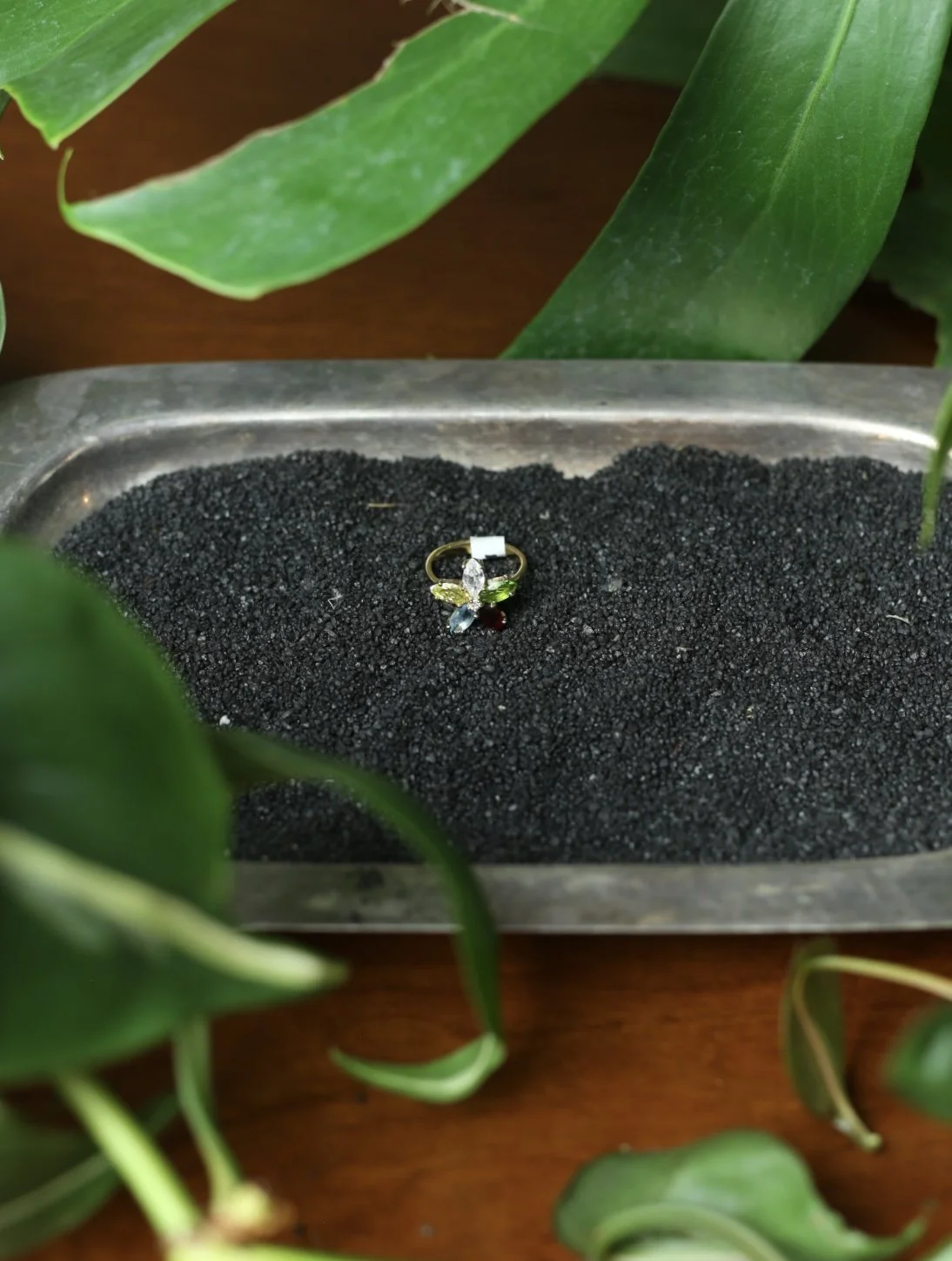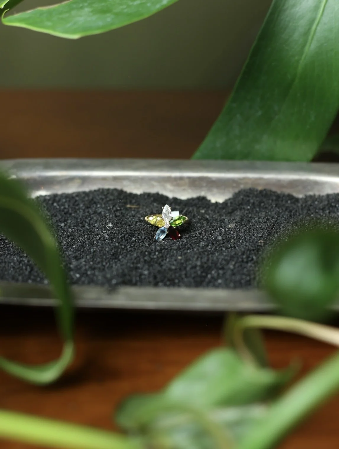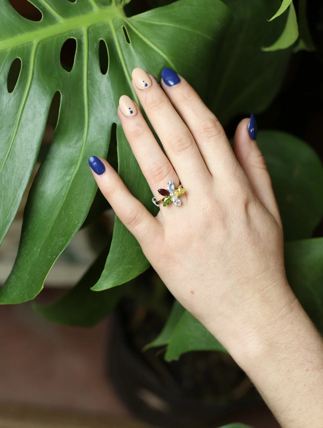 90s gold tone flower gemstone ring with clear, green, red, blue and yellow gems