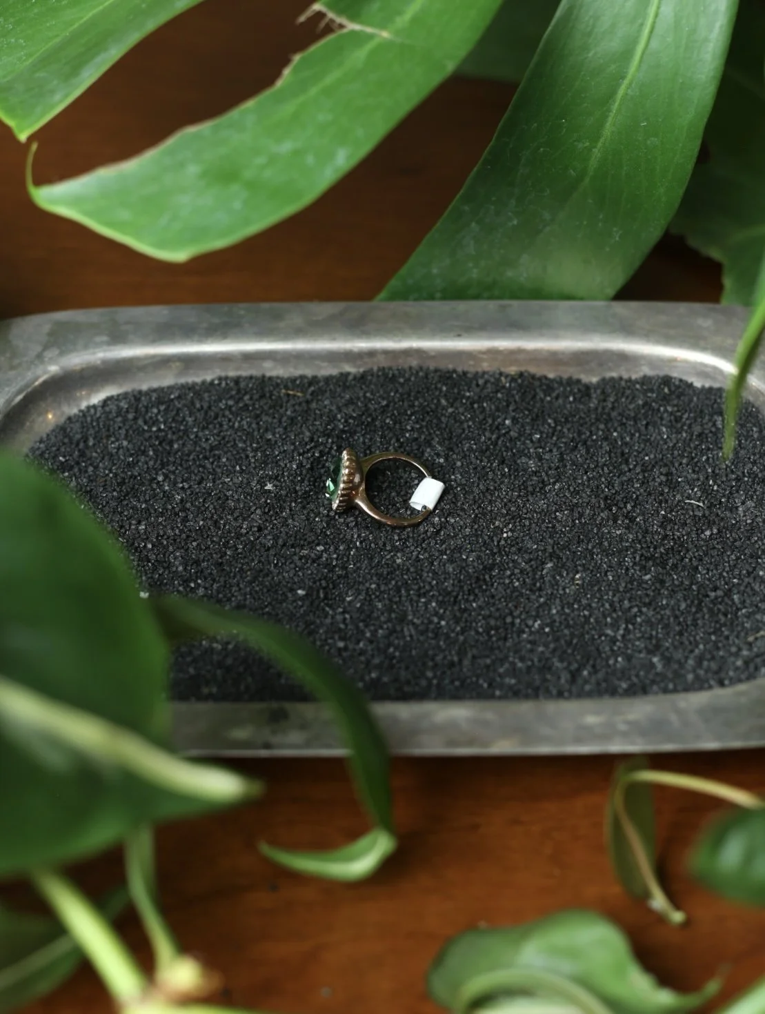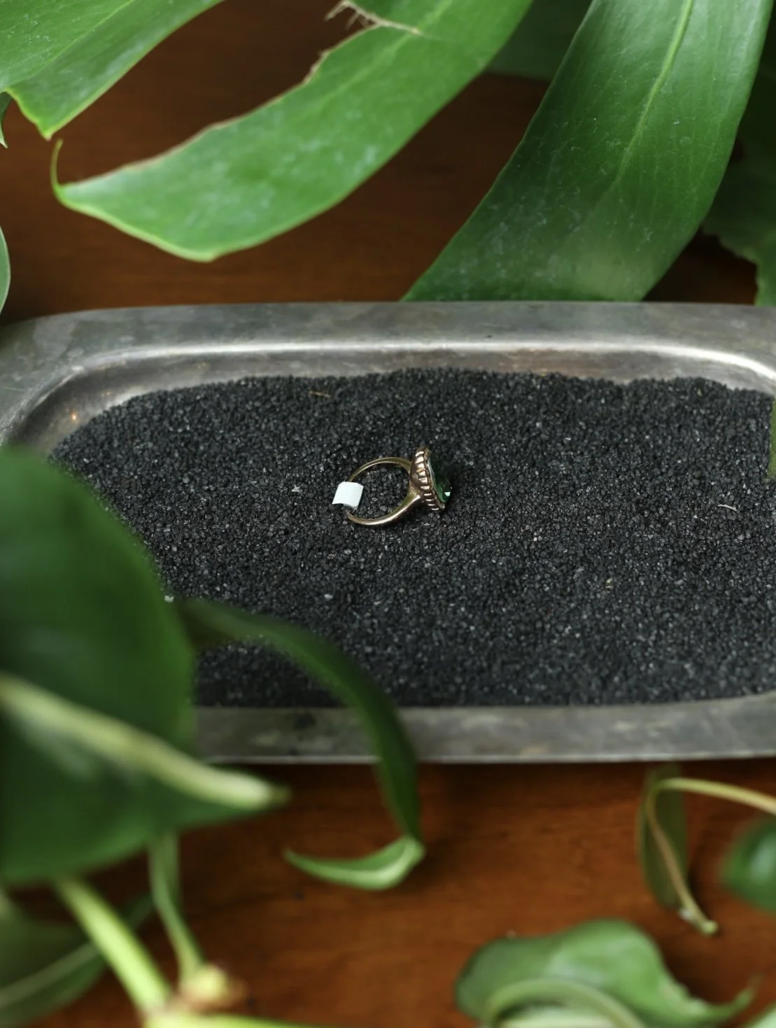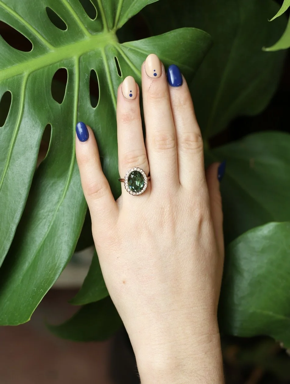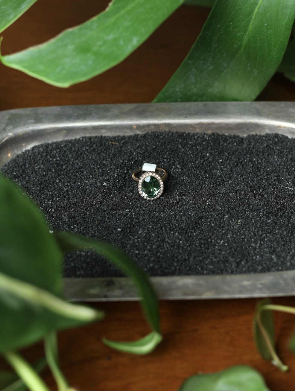Rose gold tone ring with a large oval green jam, and a halo of rhinestones