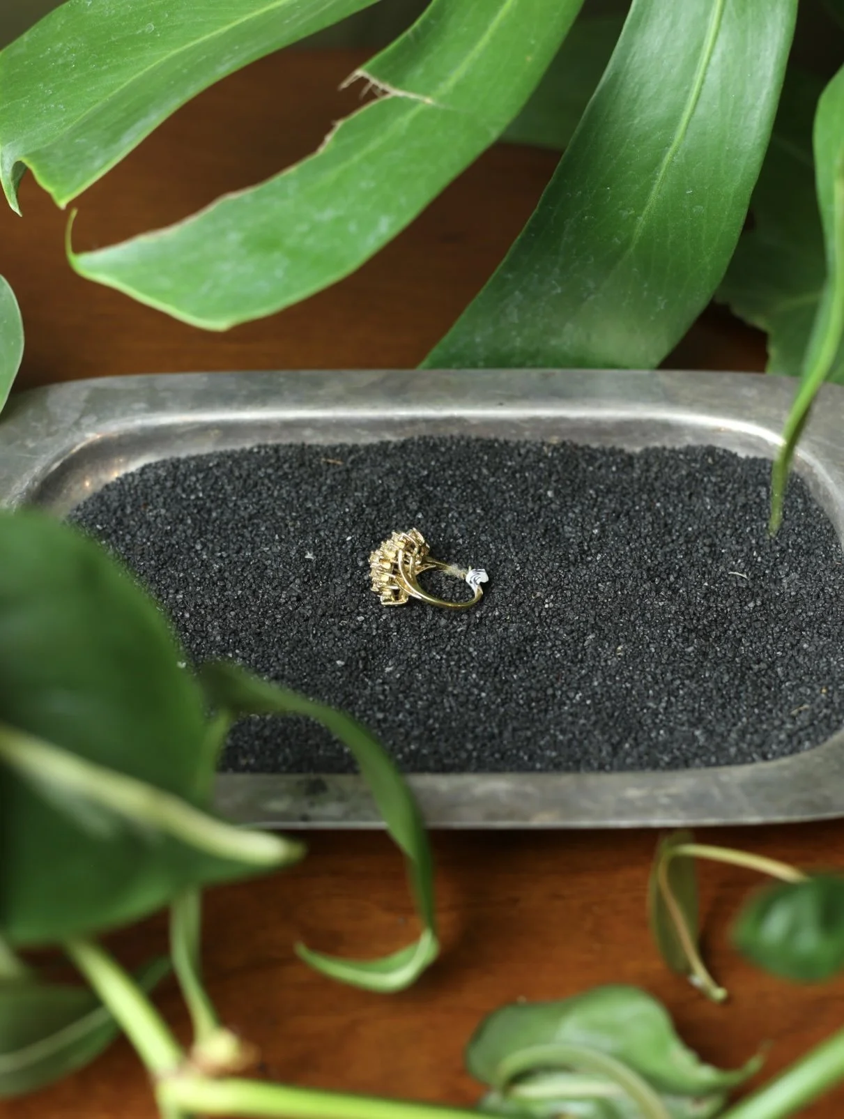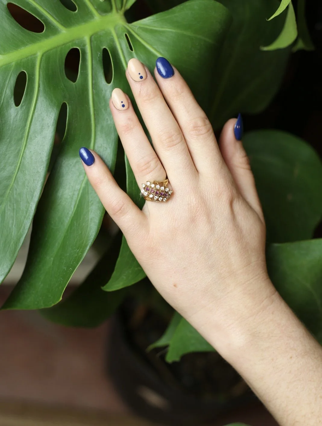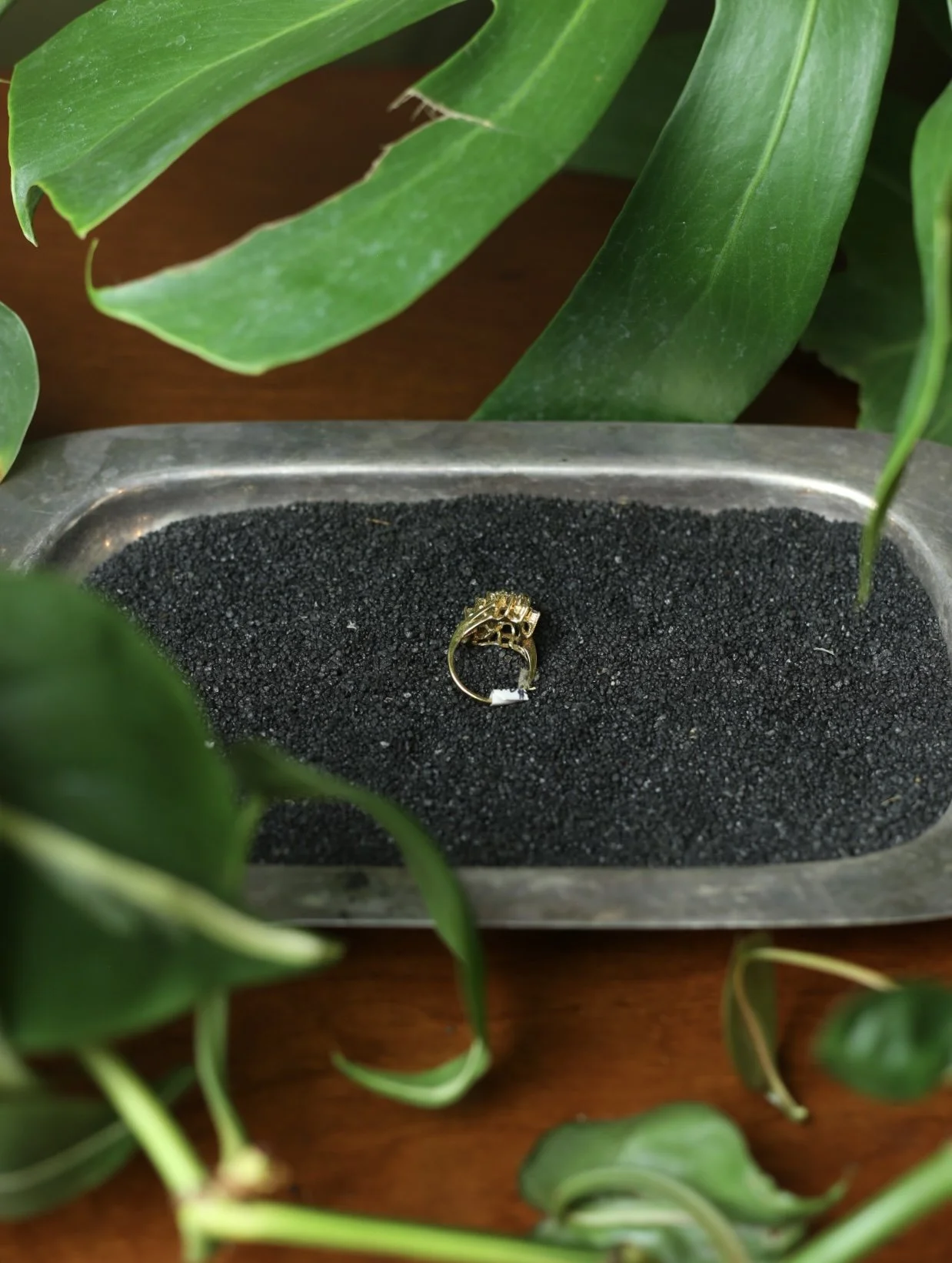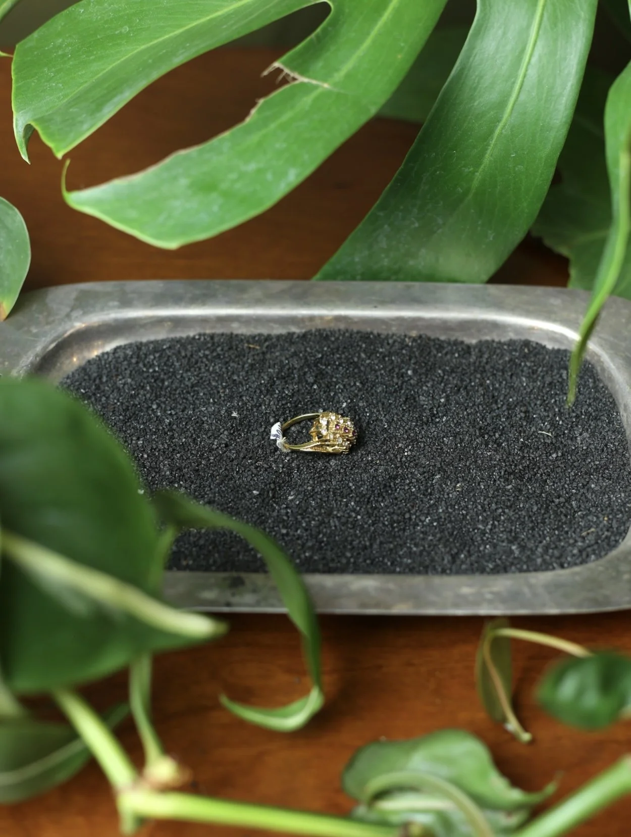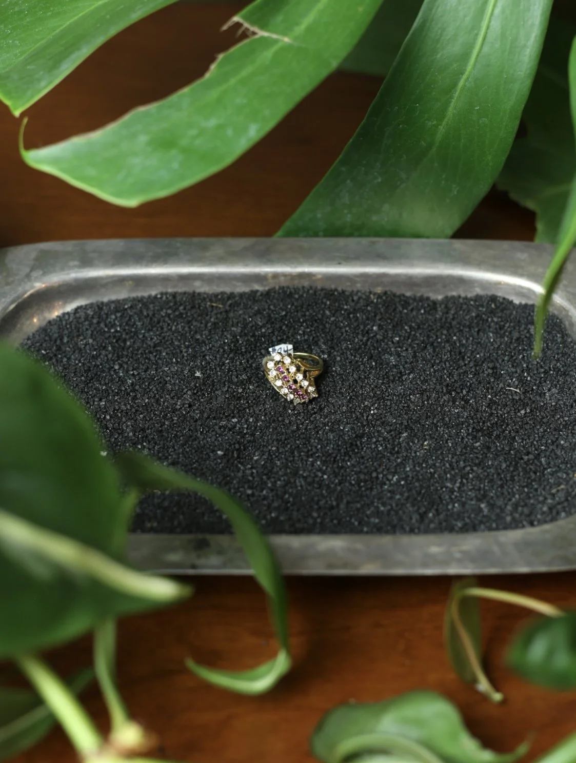 Gold tone Diagonal cluster Style ring with clear photo, diamond gems, and a center strip of amethyst gems