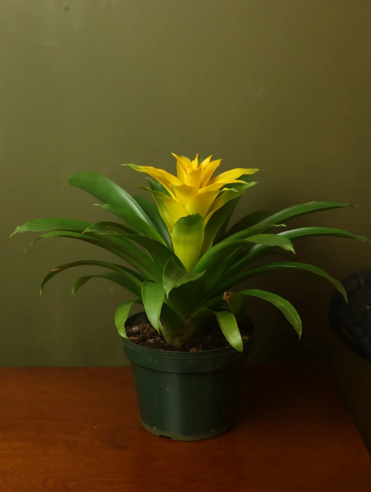 This unique plant is found in nature on the sides of trees. Unlike other plants, bromeliads take in water through the lower center vase. The soil itself should be water occasionally. The water in the lower center should be changed out every few weeks. Donβt add water to the top yellow flowering part of the plant. Once the plant flowers it will start to shoot off pups in the soil and the main plant itself will die. The pups are then propagated to make even more bromeliads
